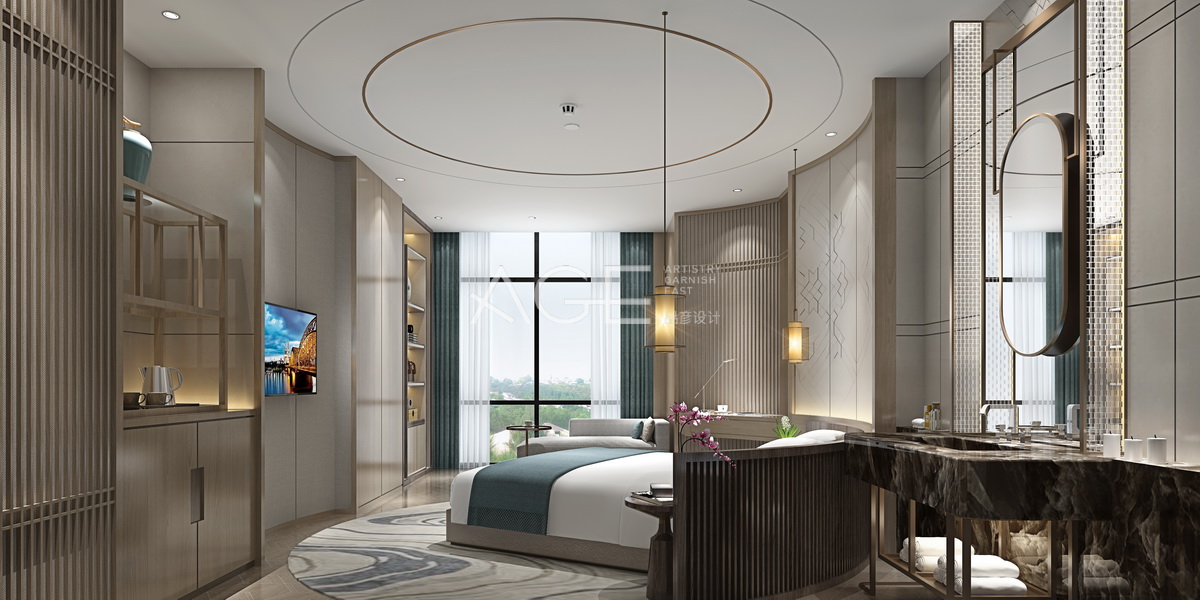 大床房現(xiàn)代與中式結(jié)合的設(shè)計(jì),讓室內(nèi)有了高雅之氣。落地大窗戶(hù),讓空間更顯得明媚亮眼,墻體用線條勾勒出中式元素,再加入現(xiàn)代時(shí)尚的細(xì)節(jié)設(shè)計(jì),完美的結(jié)合出現(xiàn)代中式的氣勢(shì)。天花板和地面上下呼應(yīng)加入圓的設(shè)計(jì),使得大床區(qū)域空間更顯得有立體感。