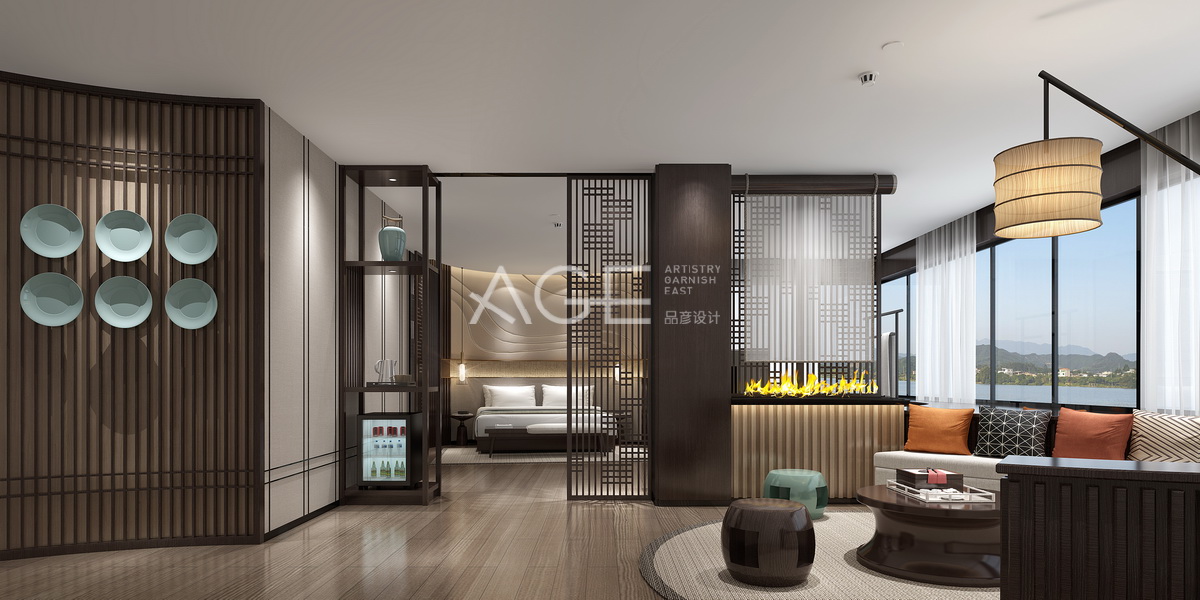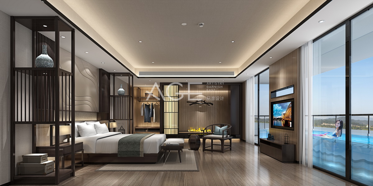 酒店特色房整體設(shè)計(jì)現(xiàn)代中式尤為突出,床頭后背景墻設(shè)計(jì)的中式風(fēng)格,與床區(qū)域兩側(cè)落地木雕柜設(shè)計(jì)相得益彰,木質(zhì)地板與天花板方形設(shè)計(jì)呈現(xiàn)相呼應(yīng)的氣勢(shì),中式座椅讓整體空間更顯得古韻氣場(chǎng),與大床相對(duì)應(yīng)的墻體設(shè)計(jì)只有一小塊用了實(shí)體,兩側(cè)則是落地大窗,左右推開(kāi)可以去釣魚(yú)或者一展游泳的風(fēng)采,從里到外的整體空間顯得實(shí)用優(yōu)雅而自然。