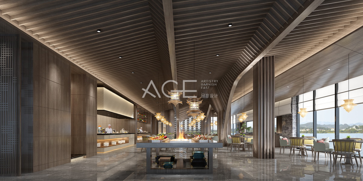 餐廳延續(xù)前廳大堂的風(fēng)格,但又顯出不一樣的美,用個(gè)性的柱體設(shè)計(jì)區(qū)分出用餐區(qū)和取餐區(qū),天花板階梯式的線條設(shè)計(jì)更讓空間有了落差的美。中式藤條元素的餐桌,提升餐廳空間的顯高大上,讓客人享受美食的同時(shí)還可以看山看水,瞬間打開(kāi)想吃的味蕾。