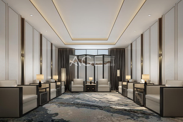 會(huì)議室作為商務(wù)型酒店必不可少的部分,該項(xiàng)目為不同類(lèi)型的會(huì)議要求定制了不同風(fēng)格的會(huì)議室。長(zhǎng)方桌的會(huì)議商務(wù)氣質(zhì)更加明顯,寬闊空間,設(shè)備齊全,地毯灰底綠紋緩解疲勞,不規(guī)則條紋相交富有動(dòng)態(tài)感。另一種采用單人單座的大型沙發(fā)呈u字型布局,背景白色作為基底以線(xiàn)條作為裝飾,干凈利落,盡顯大氣。