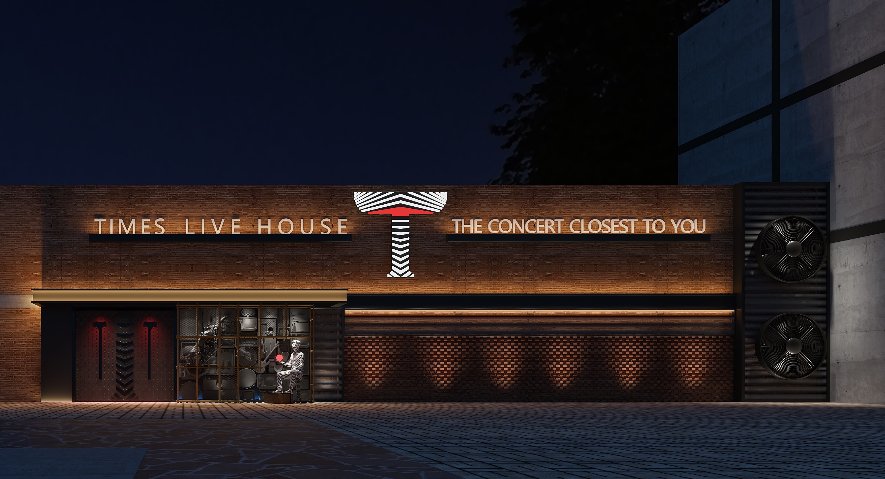 外立面設(shè)計采用復(fù)古紅磚堆砌而成,這種獨特設(shè)計一下就讓Live house與周遭采用現(xiàn)代鋼材水泥構(gòu)建的建筑區(qū)分開來,第一時間抓住消費者眼球。同時,為展現(xiàn)Live house的內(nèi)部景象,增強對路過消費者的吸引力,設(shè)計師在大門處布置了幾面透明落地玻璃,在視覺感官上縮短了消費者與Live house之間的距離。