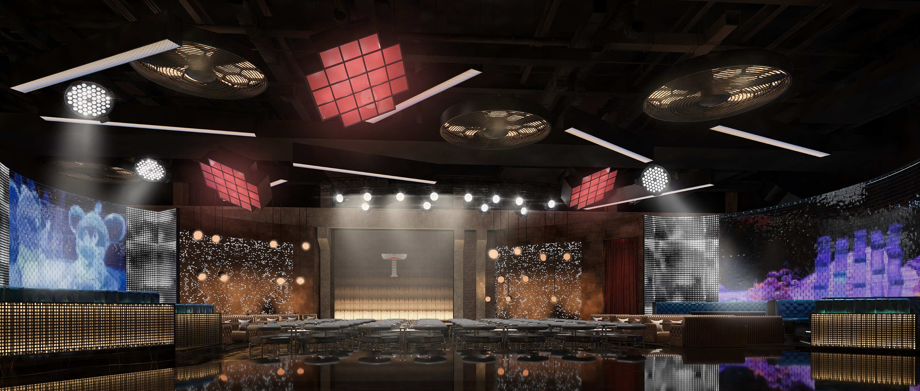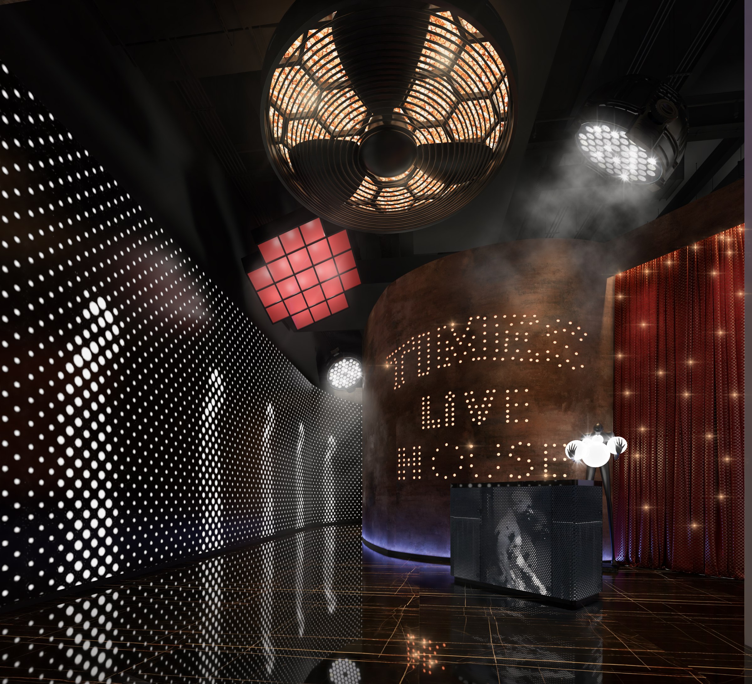 作為Live house的內(nèi)場區(qū)域,其設(shè)計更是重中之重。在整體設(shè)計上,設(shè)計師采用眾星拱月的設(shè)計格局,以演藝臺為主中心,將座位按照半圓分布,依次拓散開去。同時,在吊頂燈光的布置上,設(shè)計師同樣延續(xù)整體設(shè)計邏輯,在演藝臺的吊頂上集中布置了眾多射燈,以便在演唱時,演藝臺上能聚焦更多的燈光、擁有更多的變化,增強Live house的現(xiàn)場演繹震撼效果。