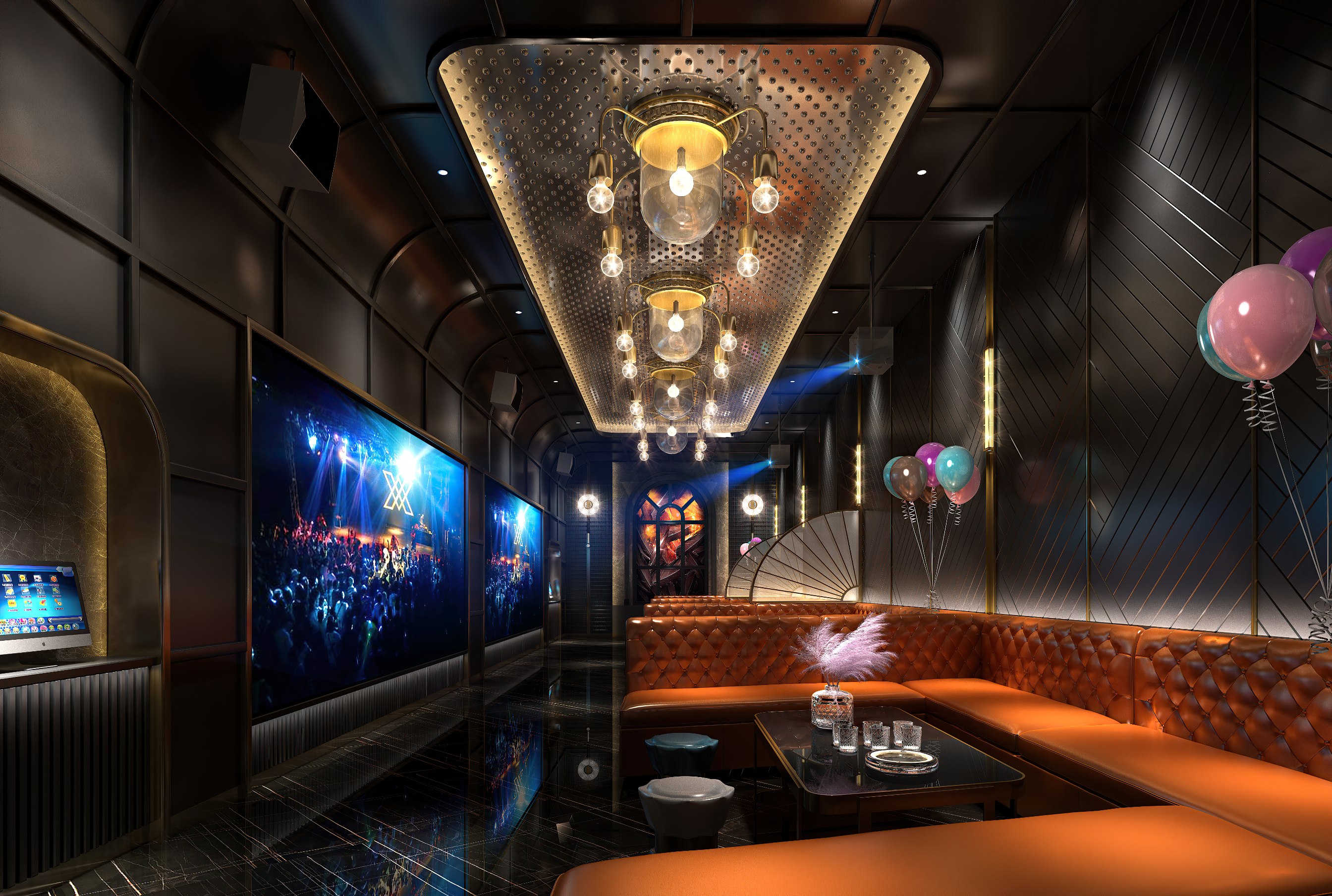 VIP區(qū)設(shè)計采用明亮的橘黃色皮質(zhì)沙發(fā),點綴高端格調(diào)。同時在空間整體設(shè)計上,設(shè)計師用淡金色的金屬建材結(jié)合擁有濃郁西方中世紀(jì)韻味的煤油燈造型燈飾,一同筑建了一個有著滿滿西方中世紀(jì)氛圍的輕奢高級區(qū)域。細節(jié)處,設(shè)計師將西方經(jīng)典彩色窗花和中式傳統(tǒng)格柵、環(huán)形古玉等元素與整體設(shè)計進行完美交融和搭配,增添了設(shè)計的厚重感。
