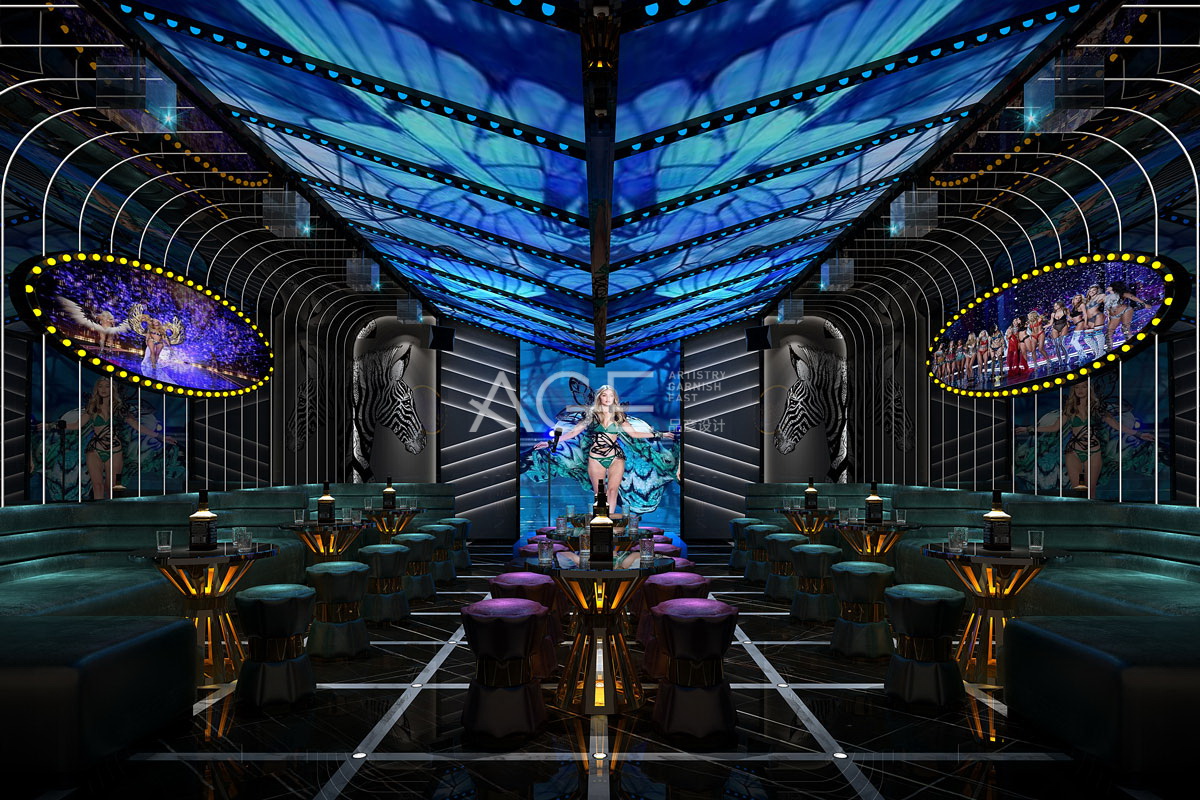 派對(duì)房設(shè)計(jì)古風(fēng)加蝴蝶元素,更有了優(yōu)雅別致的感覺(jué),天花板用線條勾勒出下墜的感覺(jué),用燈光效果打出蝴蝶樣式,下方中間一個(gè)小型舞臺(tái),墻體設(shè)計(jì)加入線條元素與天花板相連,分割出下面兩個(gè)區(qū)域,擺放了巨型轉(zhuǎn)角沙發(fā),圓桌式茶幾內(nèi)配上了燈光效果更顯好看,中間通向小舞臺(tái)是小圓桌茶幾和小圓凳,給人感覺(jué)仿佛置身于T臺(tái)秀的氛圍。