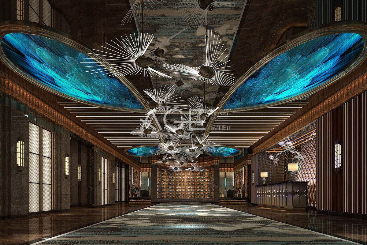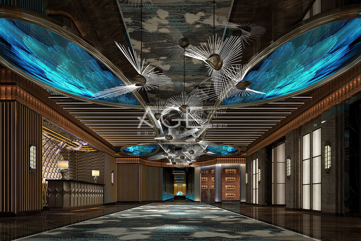 大堂,整體主色調(diào)方面帶有孔雀藍(lán)的夢幻,讓人感覺出一種神秘的優(yōu)雅,吊燈整體效果宛如一只張開的蝴蝶環(huán)繞出的燈光,盡情地飛翔在深邃的銀河之中,充斥著令人向往的神話故事。優(yōu)雅與神秘相碰撞,定能帶來別樣的體驗。不同燈效的設(shè)計襯托出輕奢的高貴,大堂角度1燈效以孔雀藍(lán)為基調(diào),輔助金色與灰白,帶給人的是高貴又神秘的優(yōu)雅。大堂角度2燈效以金色為基調(diào),孔雀藍(lán)為點綴,烘托出神秘的輕奢氣息。