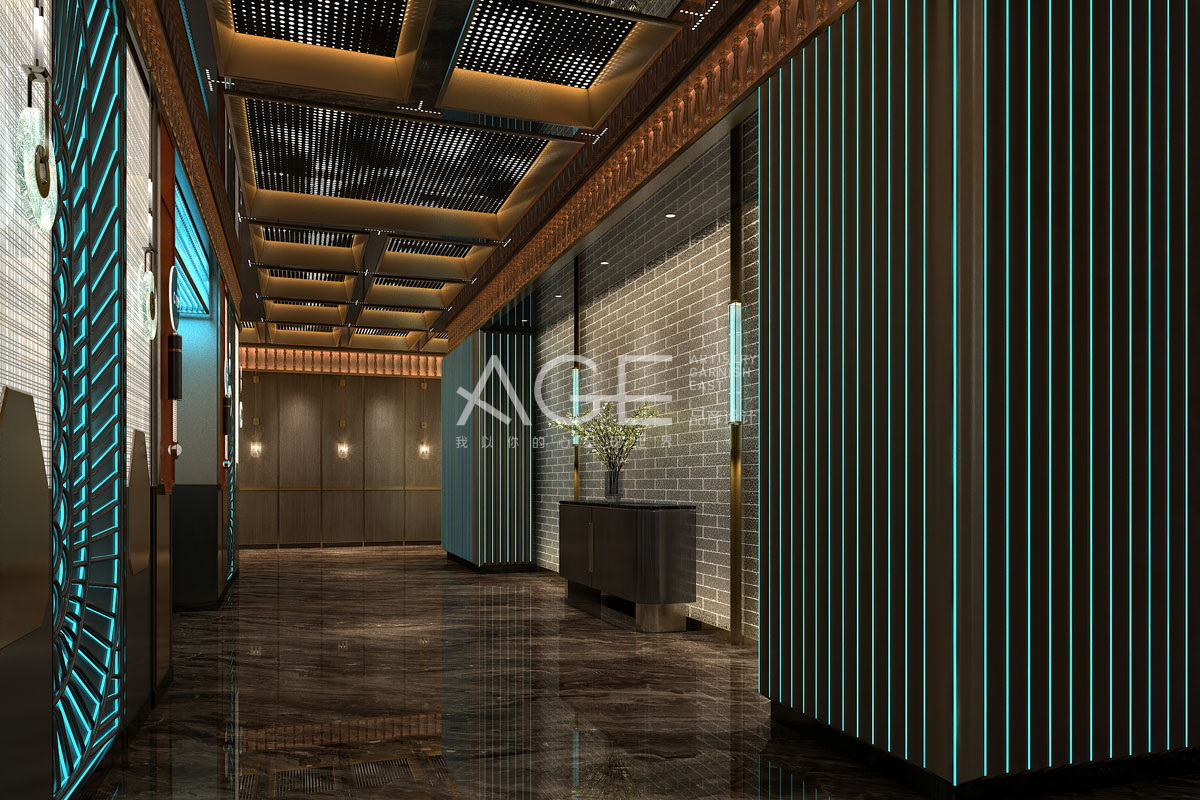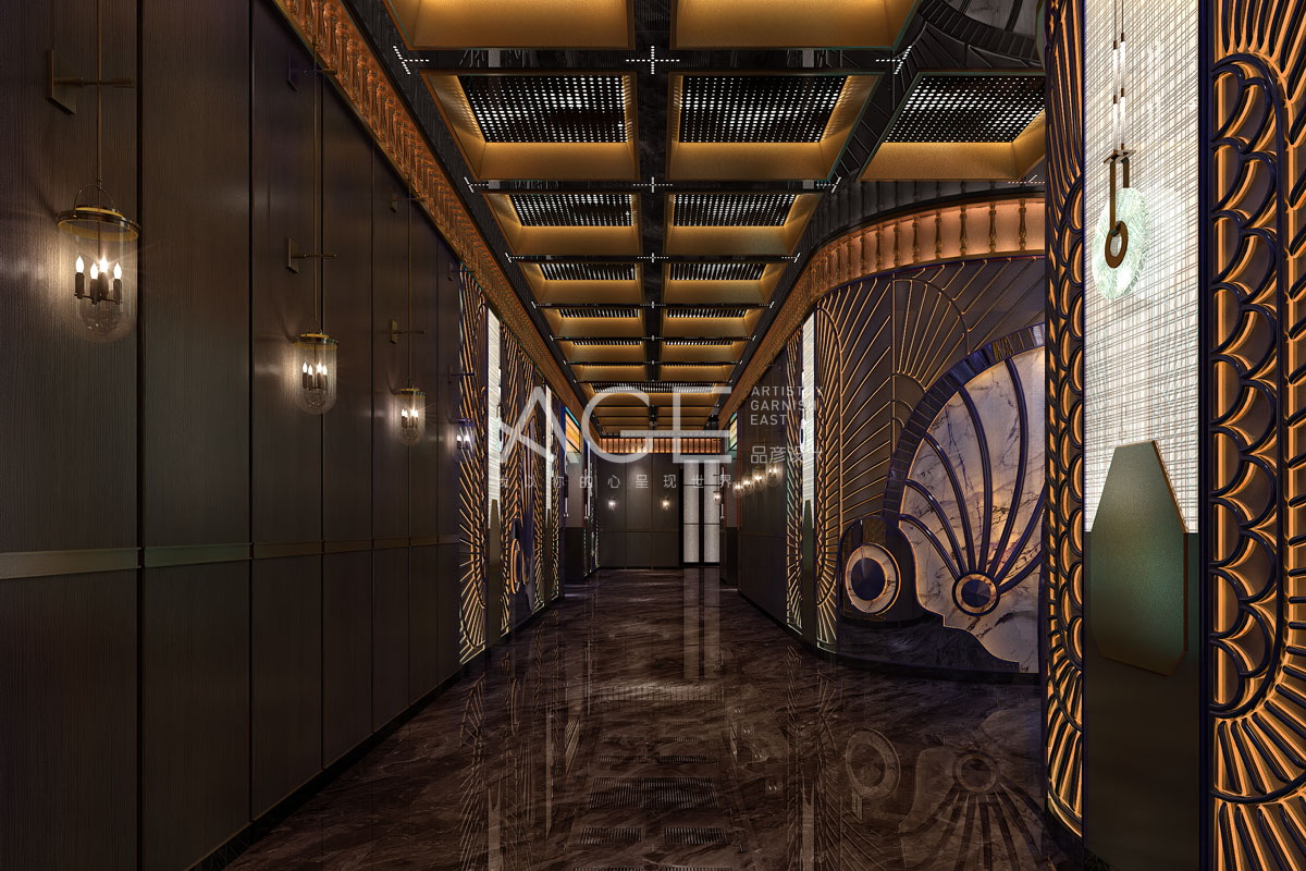 過道,整體為新中式的設(shè)計,不同的線條勾勒出錯落有序的層次感,燈光1主色調(diào)為孔雀藍(lán),配以金色系和灰色系,盡顯簡單優(yōu)雅的高貴,輕奢的裝飾和孔雀藍(lán)基調(diào)的光影呈現(xiàn)出立體的效果。燈光2主色調(diào)金色,輔色為灰,裝飾采用線條,烘托出輕奢的華麗。
