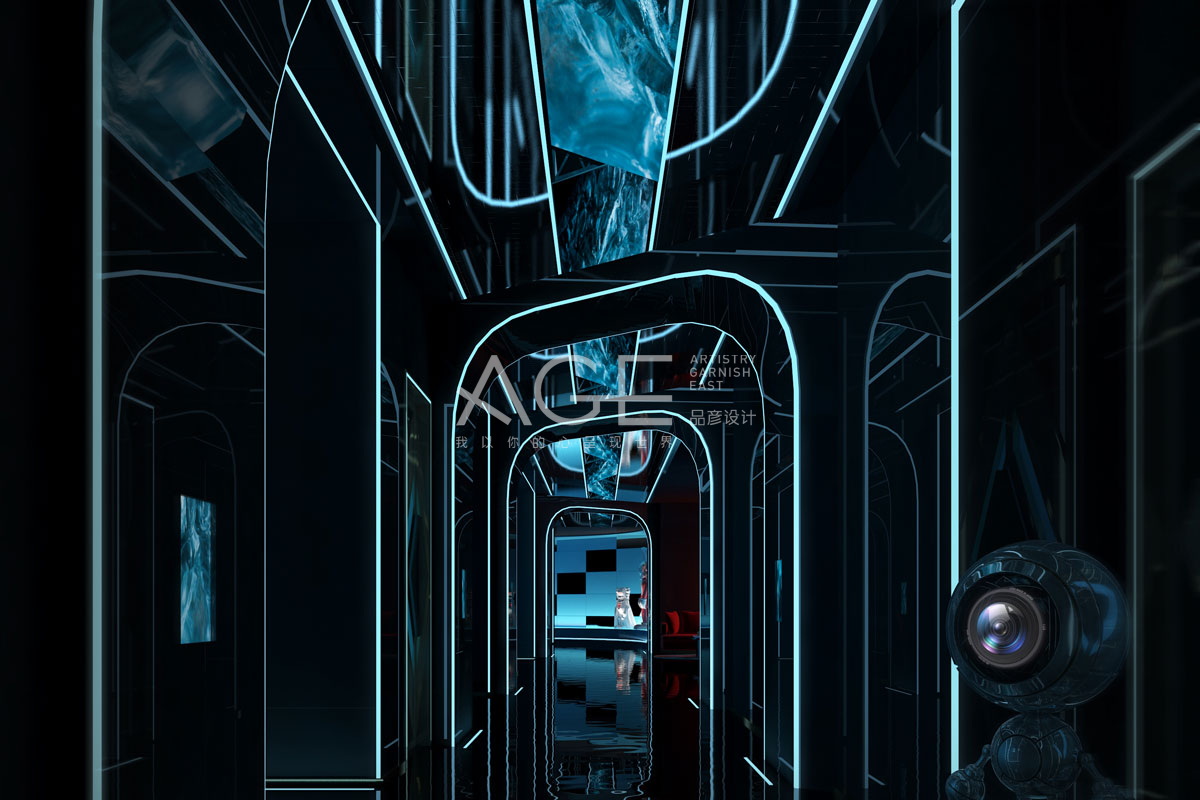 連廊,延續(xù)整體設(shè)計風(fēng)格,線條勾勒出方形或者橢圓形,襯托出立體的效果。燈效1,主色調(diào)為孔雀藍(lán)配上金色,兩者色調(diào)用輔助色灰襯托出輕奢的優(yōu)雅,形成一種獨特的空間效果,極致的彰顯空間氣質(zhì)和張力。燈效2整體色調(diào)為金色加灰色,搭配勾勒出的線條裝飾,形成立體層次感,盡顯高雅的神秘。