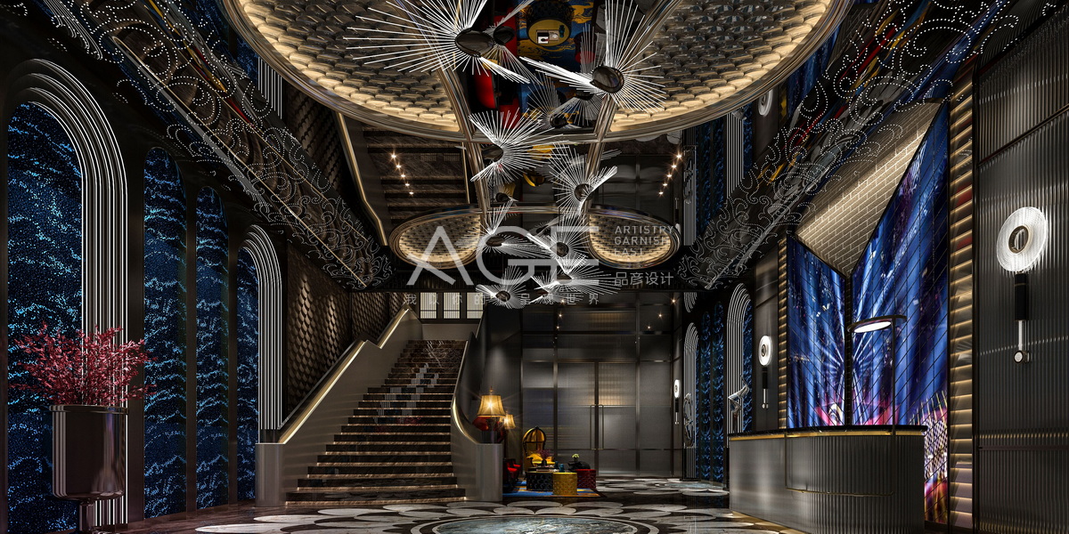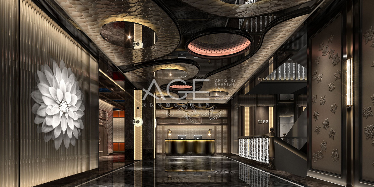 商務(wù)KTV二樓大廳一,整體空間設(shè)計個性十足,延續(xù)完整性的搭配風格又凸顯出自己獨有的魅力,讓新中式風格的設(shè)計無處不在,天花板的圓與墻體的方,讓整體涌現(xiàn)出不規(guī)則的美,一面墻壁特色的大蓮花圖案,襯托出一種優(yōu)雅的氣息,色彩搭配帶出富麗堂皇的氣場,再用燈光映襯又更顯得大氣華貴。商務(wù)KTV.二樓大廳二,整體空間設(shè)計創(chuàng)意感十足,矩形與線條元素的運用增添立體效果,天花板與一面墻采用一體的設(shè)計效果,用燈影進行不同的光源區(qū)分,并帶出時代感和特殊的意境,給人以富貴之氣。