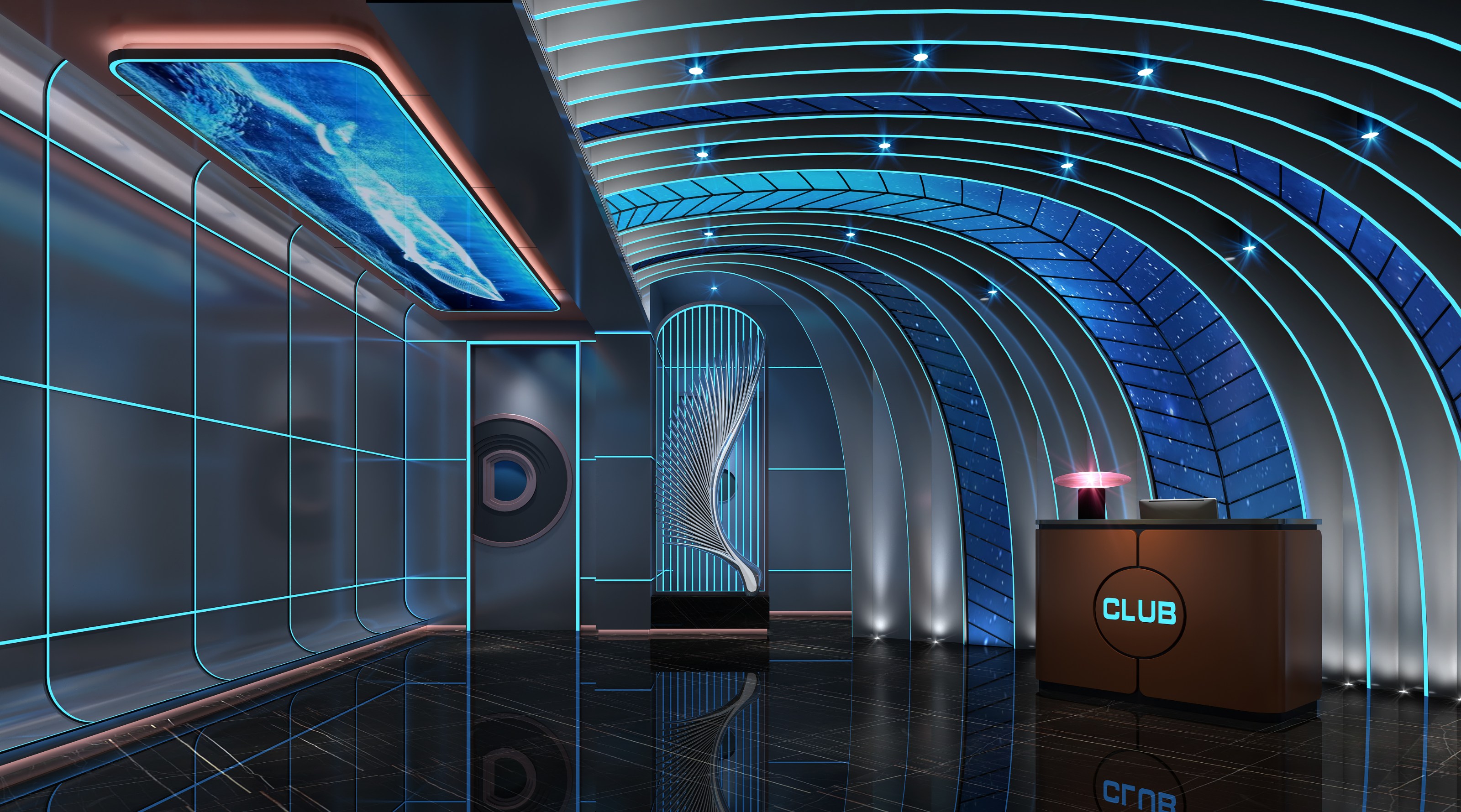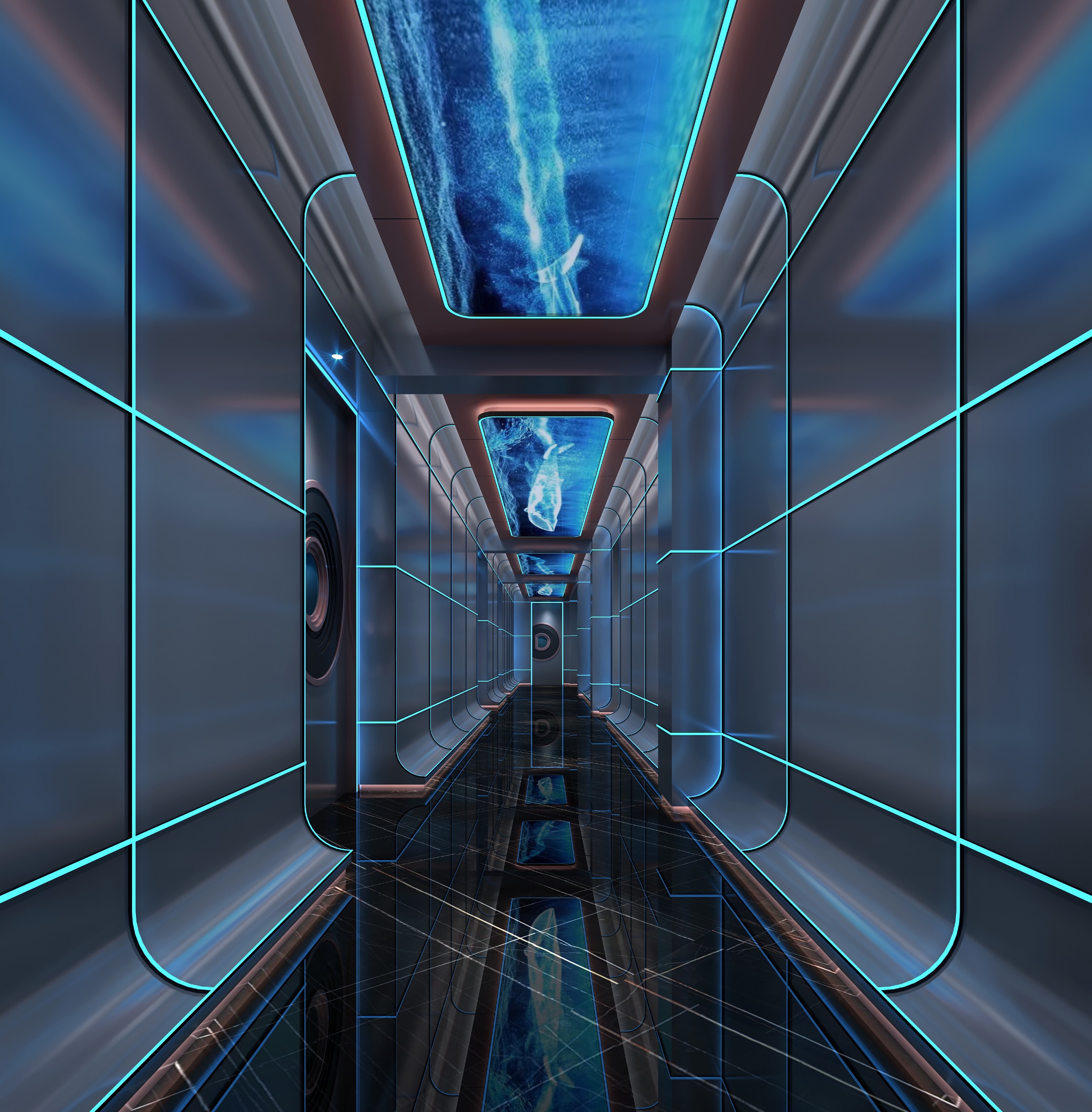 走道設(shè)計(jì)依舊延續(xù)前臺(tái)接待區(qū)風(fēng)格,兩側(cè)墻面用平整圓滑的銀色金屬色澤建材作為鋪墊,其上布滿排列有序的藍(lán)色燈帶,吊頂?shù)拿總€(gè)間隔區(qū)域均采用一整塊凸顯海底天然景觀的燈牌,用這種擠滿眼部視線的方式讓消費(fèi)者沉浸在由設(shè)計(jì)師一手構(gòu)建出的海底世界中。地面設(shè)計(jì)選擇光滑的大理石板,能最大程度的映射墻壁燈光和吊頂燈牌景色,讓整個(gè)走道空間更加和諧統(tǒng)一,融為一體。