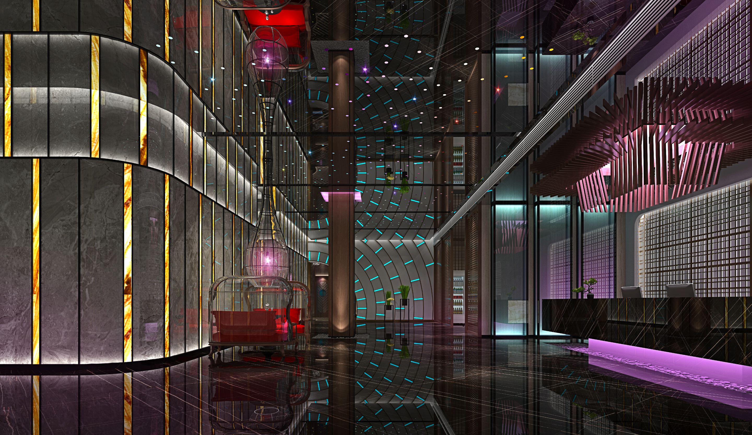 大廳設(shè)計(jì),設(shè)計(jì)師采用大面積中式設(shè)計(jì)特有元素:木質(zhì)格柵、斗拱、藻井等來(lái)體現(xiàn)會(huì)所的民族特色。在大廳的顯眼位置,設(shè)計(jì)師設(shè)計(jì)了一處西方中世紀(jì)馬車(chē)外形的沙發(fā)候客區(qū),亮眼的艷紅色沙發(fā)搭配上散發(fā)著粉紫色光芒的中世紀(jì)燈籠,讓候客區(qū)成為整個(gè)大廳的耀眼存在。吊頂設(shè)計(jì)采用平滑黑色建材,點(diǎn)綴數(shù)量繁多的星燈,在五彩斑斕的星燈和大廳繽紛燈光的映襯下,吊頂區(qū)域就好似一面散發(fā)著璀璨星光的夜空。大廳通過(guò)玫紅、淡紫、青藍(lán),亮黃等等不同燈光和裝修色澤,以及設(shè)計(jì)元素的搭配,展現(xiàn)了整體裝修設(shè)計(jì)的隨性不羈、多元素碰撞,尤為貼合貴州地區(qū)熱情強(qiáng)烈的多民族文化特性。