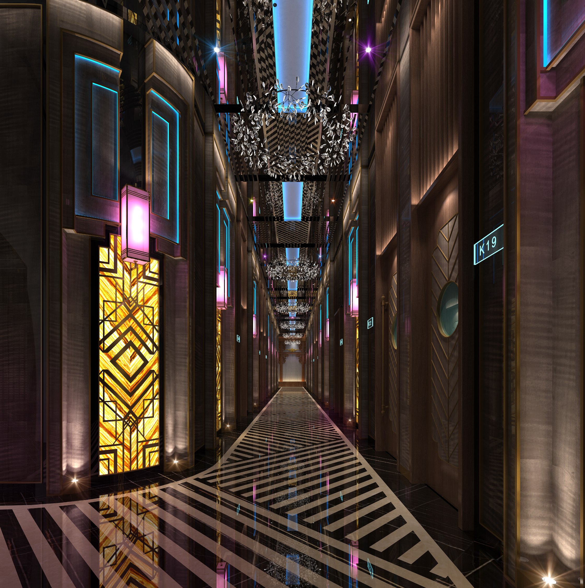 走道設(shè)計(jì)延續(xù)用艷麗色彩反映熱情奔放的地區(qū)特色的設(shè)計(jì)理念,用橘黃、亮紫、青藍(lán)等幾種色澤的燈光配合吊頂反射的整體光效,將整條走道氤氳在五彩斑斕的霓虹內(nèi),給人以熱情繁華之感。同時(shí)走道的裝修設(shè)計(jì)也極為考究,散發(fā)著橘黃色的燈牌表面采用中式園林建筑中特有的窗欞設(shè)計(jì),燈牌上部分設(shè)計(jì)則有幾分次序、規(guī)律、統(tǒng)一的意式建筑風(fēng)格韻味。吊飾設(shè)計(jì)采用草環(huán)造型,讓整體設(shè)計(jì)多了幾分貼近自然之感,地面鋪滿的黑白交錯(cuò)的斜條紋光滑地磚,在簡(jiǎn)約質(zhì)樸的同時(shí)蘊(yùn)藏著一抹遠(yuǎn)古圖騰意味。