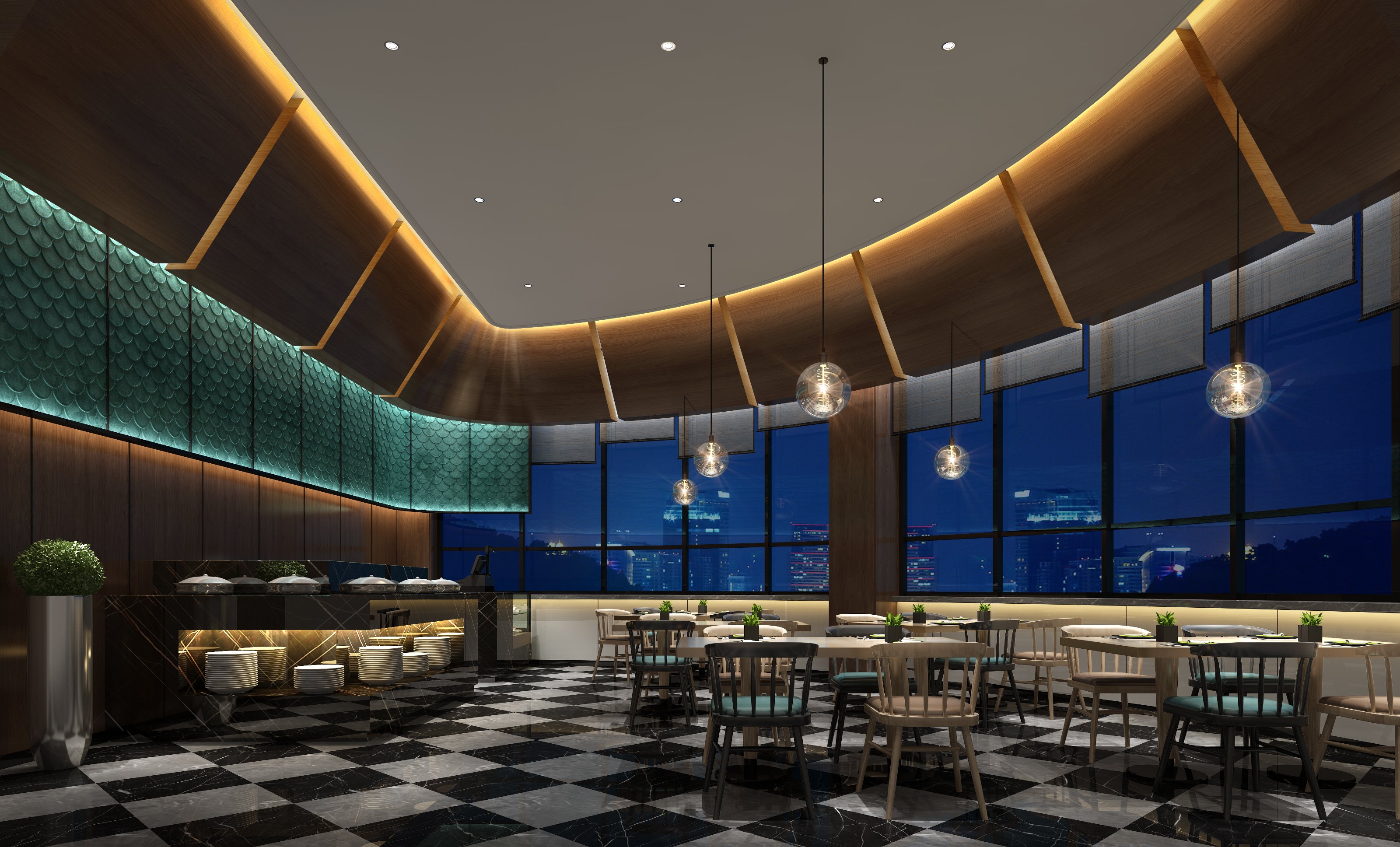自助餐區(qū)的主體設(shè)計(jì),包括整體空間、吊頂及一旁窗戶,皆是采用了圓角設(shè)計(jì)。其搭配點(diǎn)綴的細(xì)節(jié)裝飾用到中式傳統(tǒng)元素,有充滿古韻的中式紗布窗簾,有像龍鱗般有序排列的綠瓦裝飾。設(shè)計(jì)師采用地中海建筑風(fēng)格搭配中式傳統(tǒng)設(shè)計(jì)風(fēng)格,為消費(fèi)者呈現(xiàn)一個(gè)閑適浪漫寧?kù)o的用餐空間。