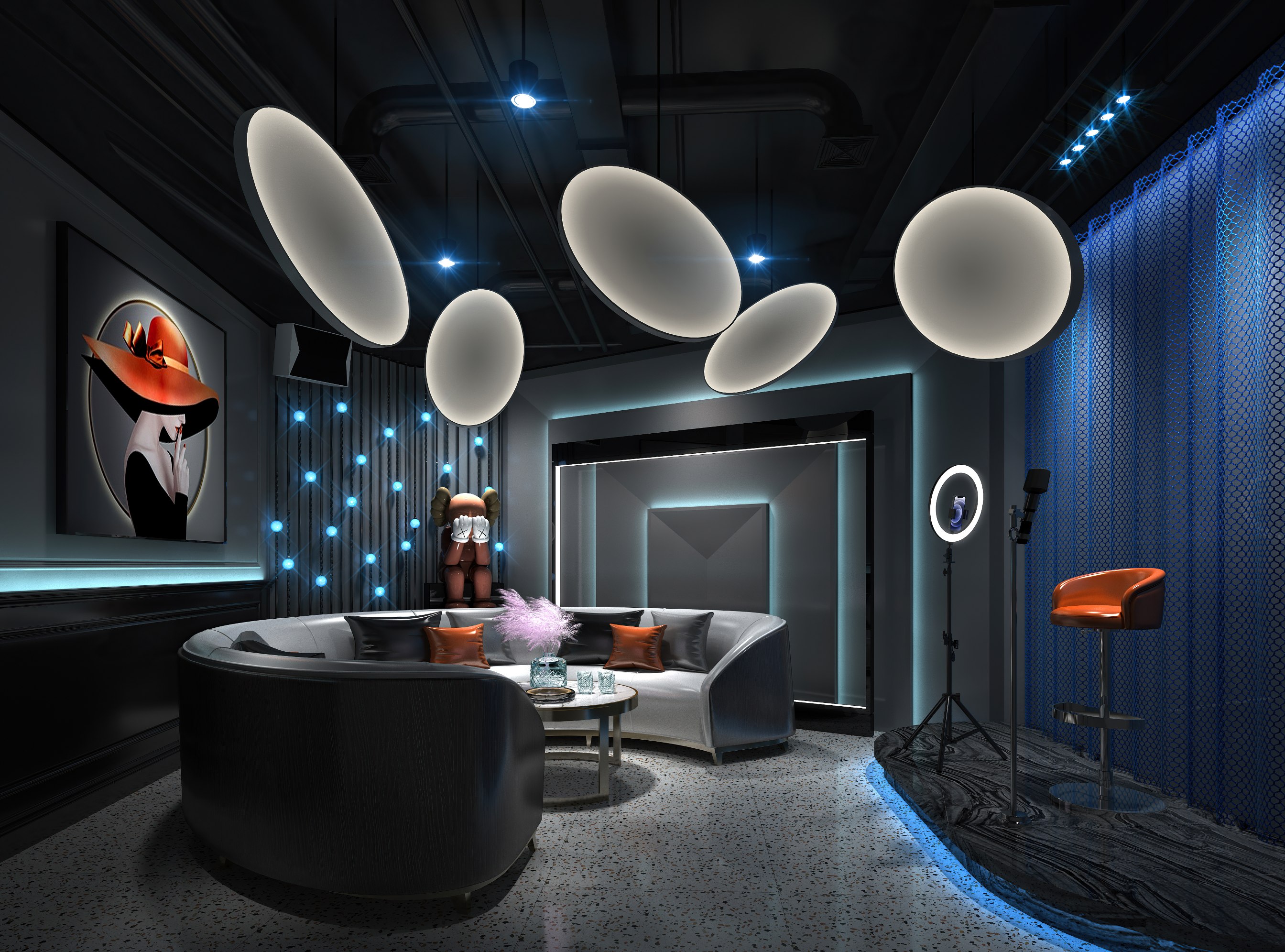 為了在面積有限的情況下容納更多不同類型的小型派對房,設(shè)計師直接采用截然不同的燈光色彩率先給予顧客視覺沖擊,簡單明了地突出風(fēng)格。再者,根據(jù)包廂相對狹隘的空間情況,設(shè)計師大膽創(chuàng)新地使用當下熱門的直播為創(chuàng)意,打造了一個有別于傳統(tǒng)KTV的直播演唱臺,將消費者原本聚焦在演唱屏幕的目光轉(zhuǎn)移到演唱者身上。
