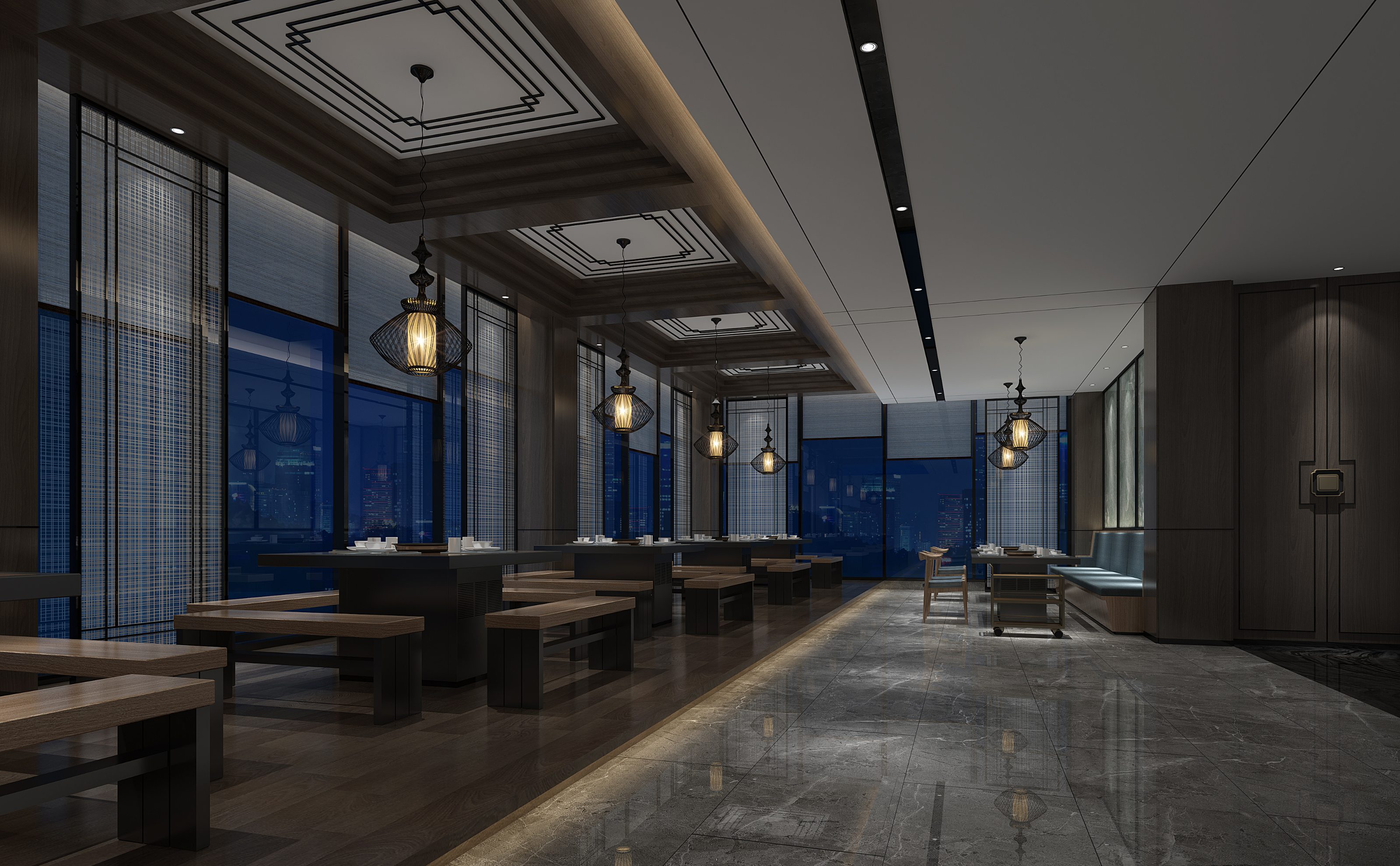 大廳采用多面落地窗設(shè)計(jì),將餐廳外圍景色映射到內(nèi)部,提升視野開闊感。同時(shí)為避免大廳整體設(shè)計(jì)與消費(fèi)者接收的外圍景觀產(chǎn)生割裂感,在大廳設(shè)計(jì)方面,設(shè)計(jì)師除了沿用藻井、格柵、宮燈等中式傳統(tǒng)設(shè)計(jì)元素外,還采用了現(xiàn)代極簡(jiǎn)風(fēng)格進(jìn)行裝修設(shè)計(jì),這樣融合傳統(tǒng)與現(xiàn)代產(chǎn)生的設(shè)計(jì),在大廳內(nèi)部整體裝修設(shè)計(jì)不沖突的同時(shí),還兼容了外部映入的現(xiàn)代景色,可謂一舉兩得,神來(lái)之筆。