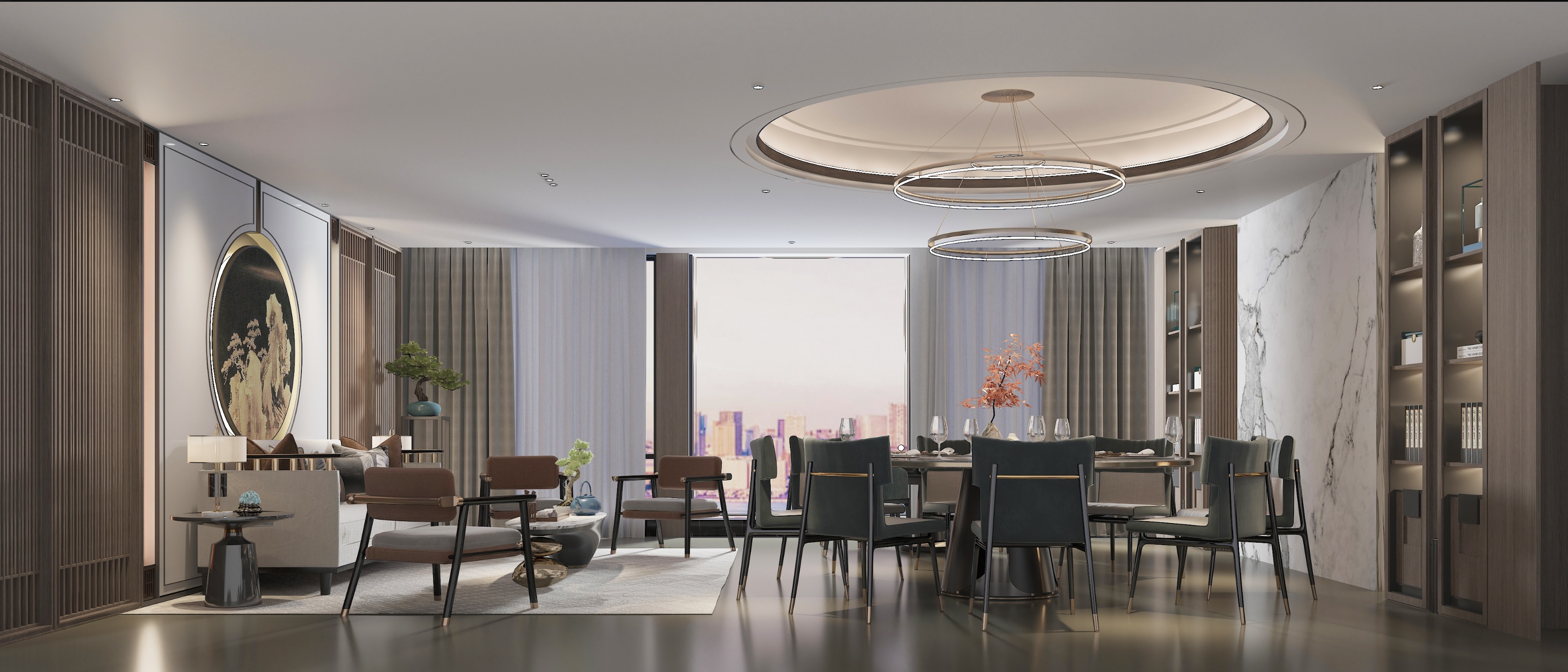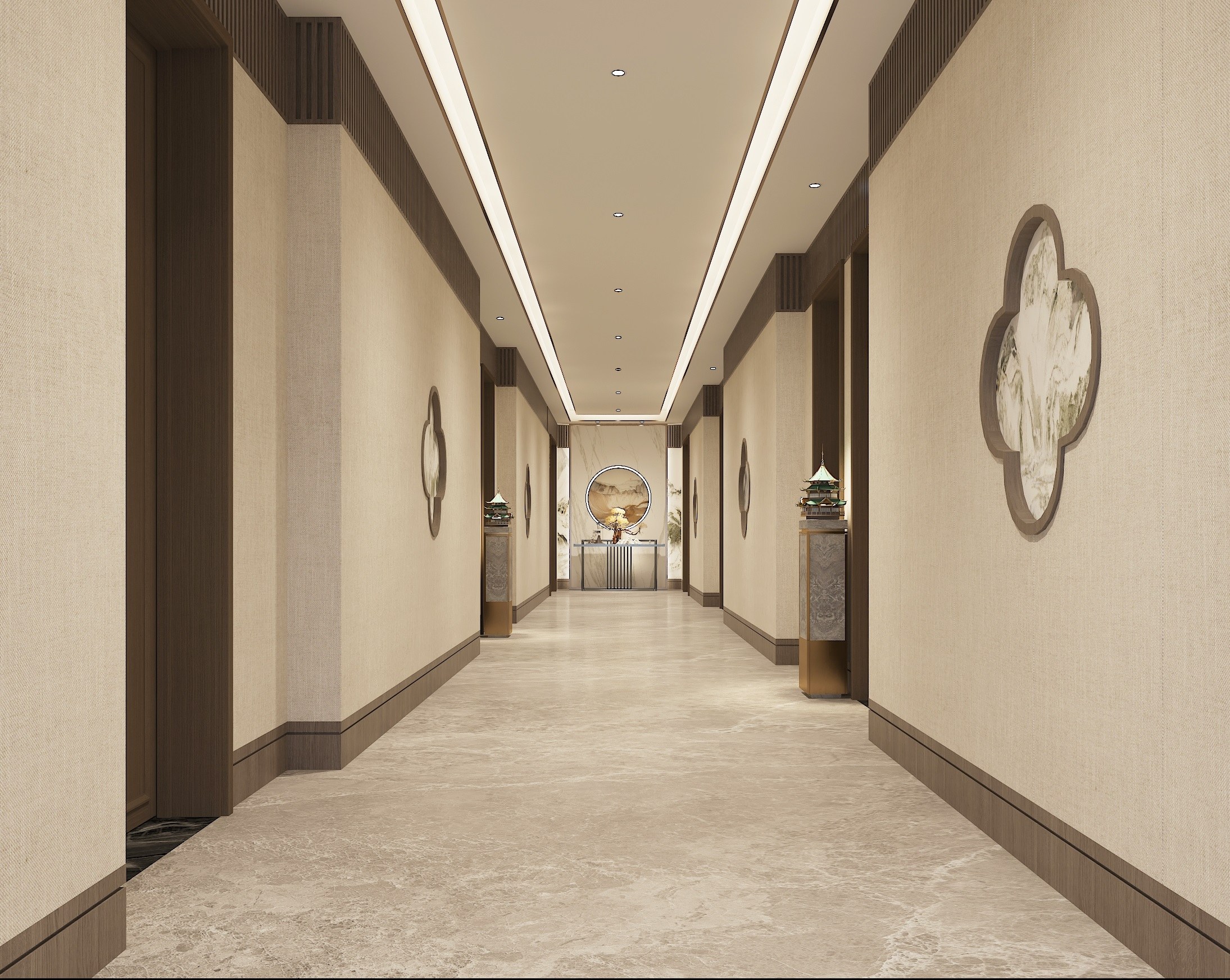 走廊過(guò)道設(shè)計(jì)以寬闊平整彰顯大氣,整體裝修色調(diào)以米白色搭配木色營(yíng)造溫馨淡雅氛圍。走道兩側(cè)墻面裝飾,設(shè)計(jì)師采用梅花漏窗這一蘇式園林建筑中獨(dú)具韻味的設(shè)計(jì)元素,結(jié)合水墨山水畫卷和精致小巧的微縮八角亭,將開闊寧?kù)o和古韻綿長(zhǎng)完美帶入到走廊過(guò)道的整體設(shè)計(jì)中。