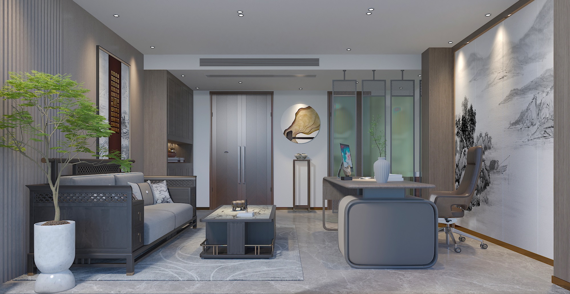 辦公室設(shè)計(jì)為貼近現(xiàn)代辦公所需,其裝修設(shè)計(jì)注定要兼具辦公實(shí)用性外,還應(yīng)該與茶室整體裝修氛圍相一致。因此設(shè)計(jì)師在茶室辦公室的設(shè)計(jì)上,采用了相對(duì)簡(jiǎn)約和色系一致的現(xiàn)代辦公用品,讓其融入整體由中式傳統(tǒng)建筑元素組成的淡雅古韻的設(shè)計(jì)環(huán)境中,不顯突兀。