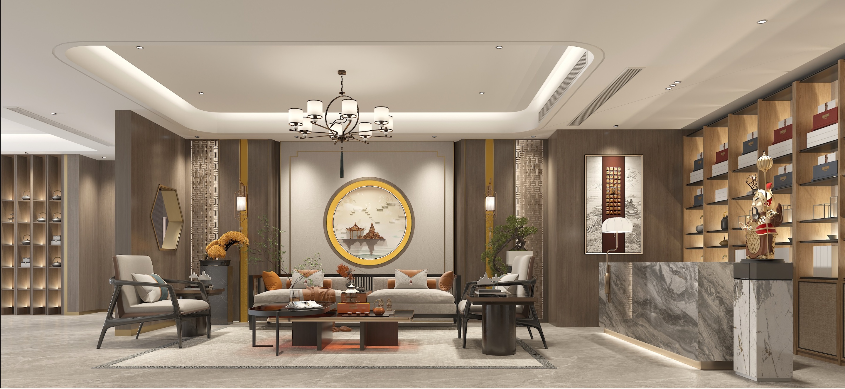 前臺(tái)大廳作為接待消費(fèi)者的第一道門戶,其裝修設(shè)計(jì)會(huì)直接影響消費(fèi)者對(duì)于茶室的整體觀感。因此在本案前臺(tái)大廳的設(shè)計(jì)上,設(shè)計(jì)師采用現(xiàn)代極簡(jiǎn)風(fēng)格搭配細(xì)節(jié)處的中式經(jīng)典元素,像姿態(tài)各異的盆栽、清新淡雅的古韻壁畫、經(jīng)典窗欞紋路和古典宮燈等等,讓整個(gè)前臺(tái)大廳呈現(xiàn)出一種高端淡雅氣質(zhì)的同時(shí),也飽含東方文化底蘊(yùn)。除此,設(shè)計(jì)師還別出心裁的在前臺(tái)工作區(qū)域上放置了一尊Q版中國(guó)古代大將軍像,為整個(gè)前臺(tái)大廳的裝修設(shè)計(jì)添上一抹亮色和趣味。