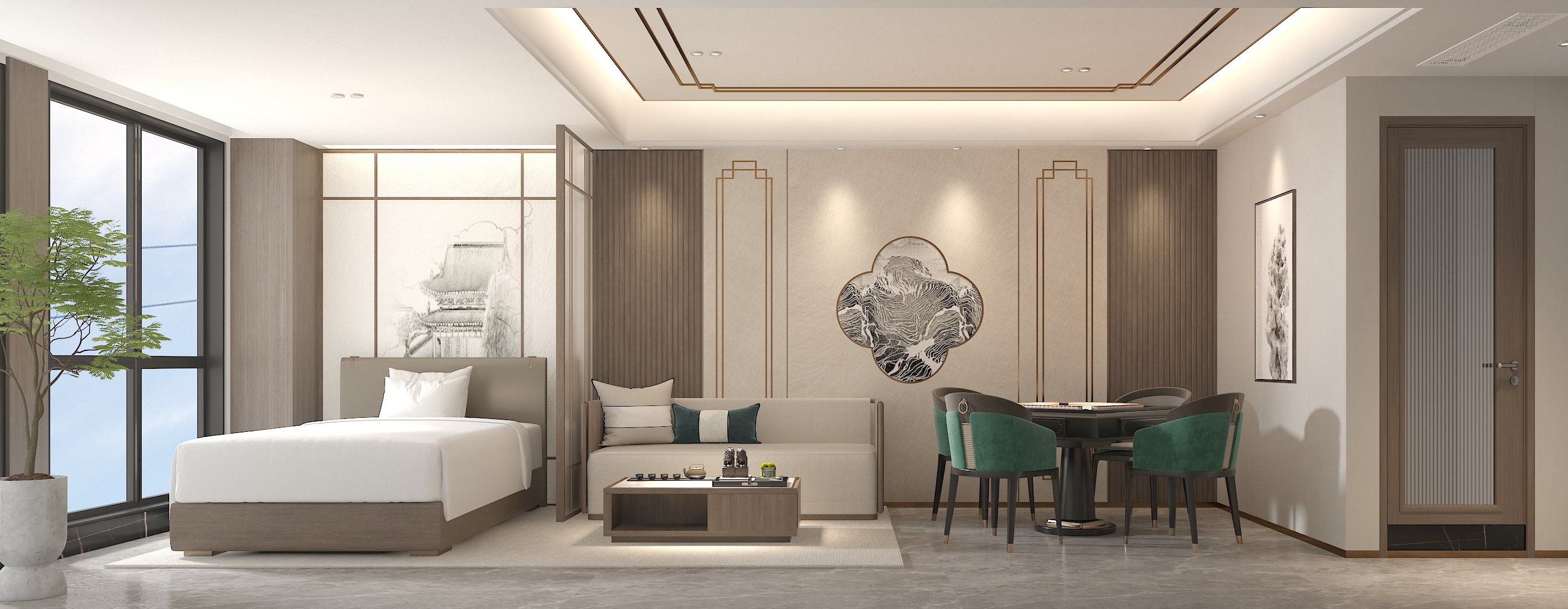 建筑的裝修設(shè)計(jì)風(fēng)格必須與其所承載的功能相統(tǒng)一,這樣才能讓消費(fèi)者在所處空間內(nèi)放松身心,完全沉浸。譬如本案重慶茶室,作為現(xiàn)代茶室設(shè)計(jì),必須在展現(xiàn)茶道意蘊(yùn)的同時(shí),貼合現(xiàn)代消費(fèi)者較為清新淡雅的審美傾向,這樣才能避免茶室裝修設(shè)計(jì)過(guò)度金碧輝煌而顯得市儈庸俗,也避免太于經(jīng)典古雅而讓消費(fèi)者感到束縛壓抑。