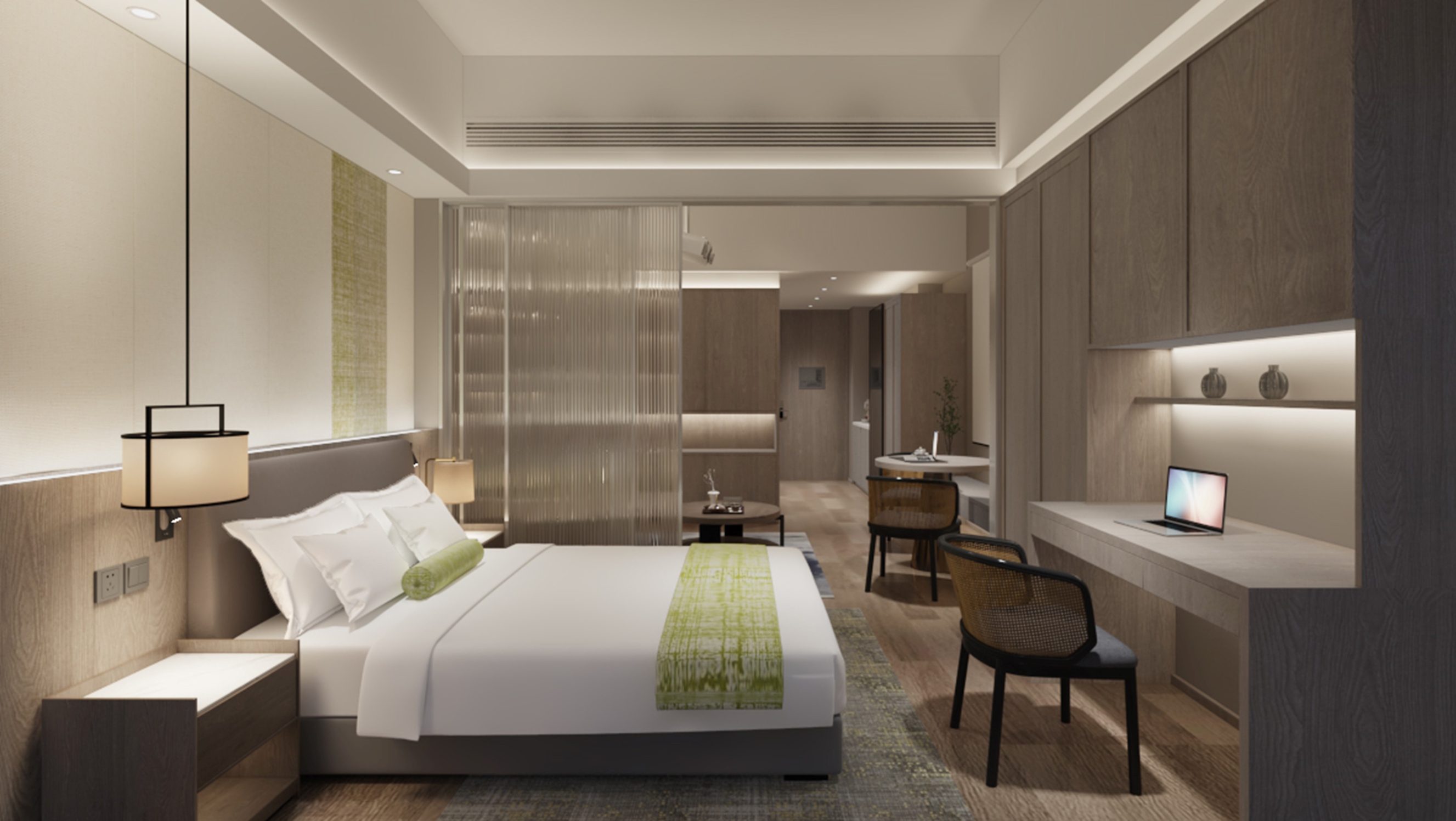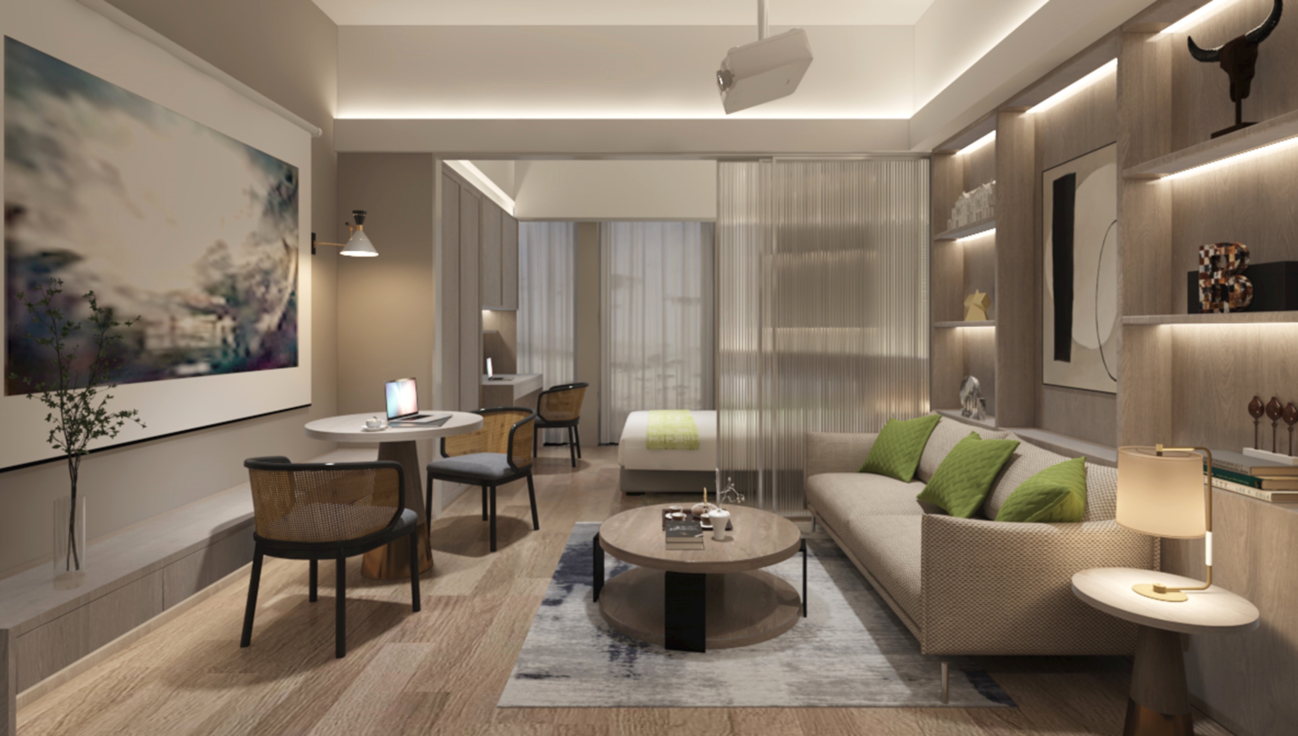酒店房間作為酒店設(shè)計(jì)的重中之重,設(shè)計(jì)師去繁就簡(jiǎn),放棄過于繁雜花哨的室內(nèi)裝修設(shè)計(jì),改用簡(jiǎn)約規(guī)整的設(shè)計(jì)搭配原木色裝飾,點(diǎn)綴清新淡雅的墻畫和抱枕等細(xì)節(jié),在體現(xiàn)酒店房間清雅大氣的同時(shí),營造自然溫馨氛圍。另外,設(shè)計(jì)師用推拉式長(zhǎng)虹玻璃門劃分出了客廳和臥室兩個(gè)功能區(qū),在增強(qiáng)區(qū)域感的同時(shí),又提升了消費(fèi)者對(duì)于臥室的私密感。不僅于此,設(shè)計(jì)師還用投影儀和幕布代替?zhèn)鹘y(tǒng)電視,這樣既保證了房間的娛樂需求,又不破壞房間線條設(shè)計(jì)的一體性。