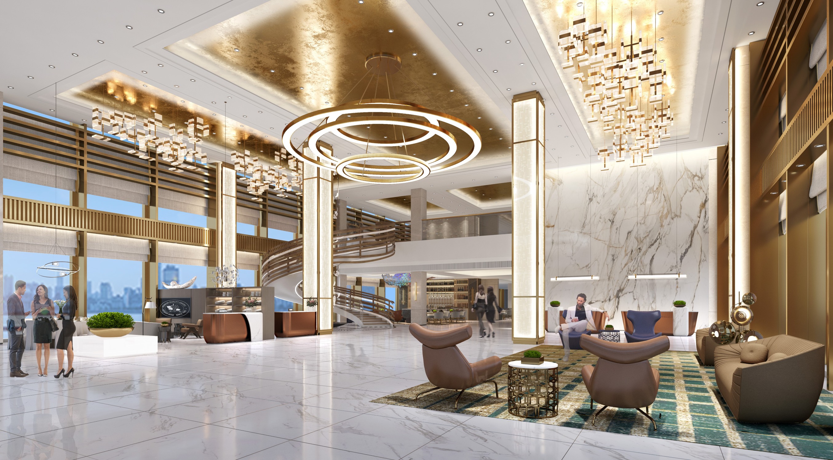 大堂設(shè)計(jì),設(shè)計(jì)師采用多面高強(qiáng)度落地玻璃取締傳統(tǒng)全封閉墻壁,這樣既大大提高了酒店大堂的整體采光,又增強(qiáng)了整個(gè)大堂區(qū)域的通透感和視覺延伸感。同時(shí),設(shè)計(jì)師在金色元素的運(yùn)用上極為克制,選擇了飽和度較低的淺金色點(diǎn)綴大面積白色,這樣既不會(huì)讓整體空間設(shè)計(jì)顯得過于金碧輝煌而導(dǎo)致俗氣,又不至于讓整體裝修設(shè)計(jì)因?yàn)樘^單調(diào)而顯得枯燥。除此,在大堂的燈光設(shè)計(jì)上,設(shè)計(jì)師摒棄了會(huì)對(duì)人眼產(chǎn)生直射的強(qiáng)硬光線,轉(zhuǎn)而采用分布式的燈光設(shè)計(jì),這樣既滿足了大堂的照明所需,又用無處不在的暖黃燈光營造了一個(gè)溫馨的氛圍。