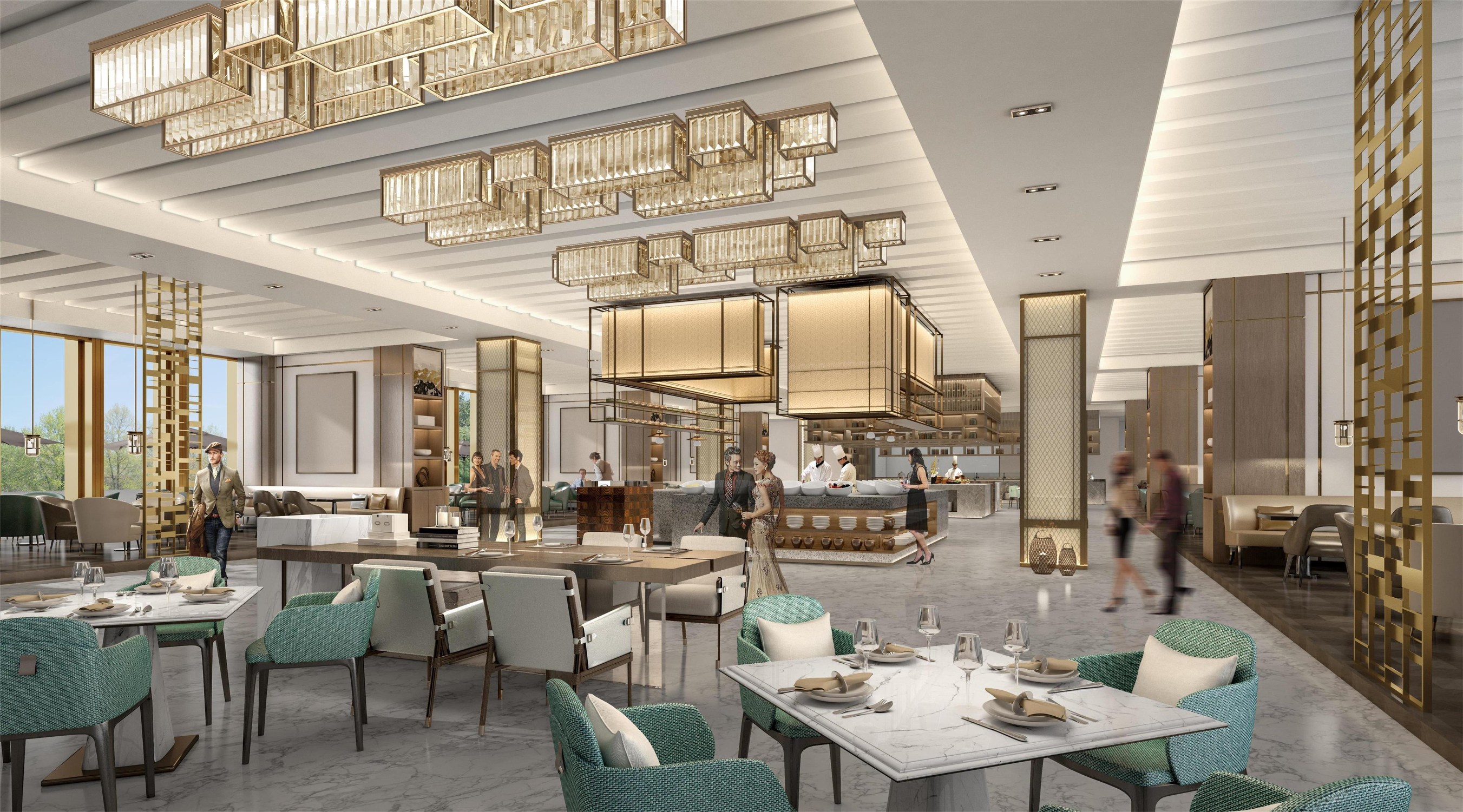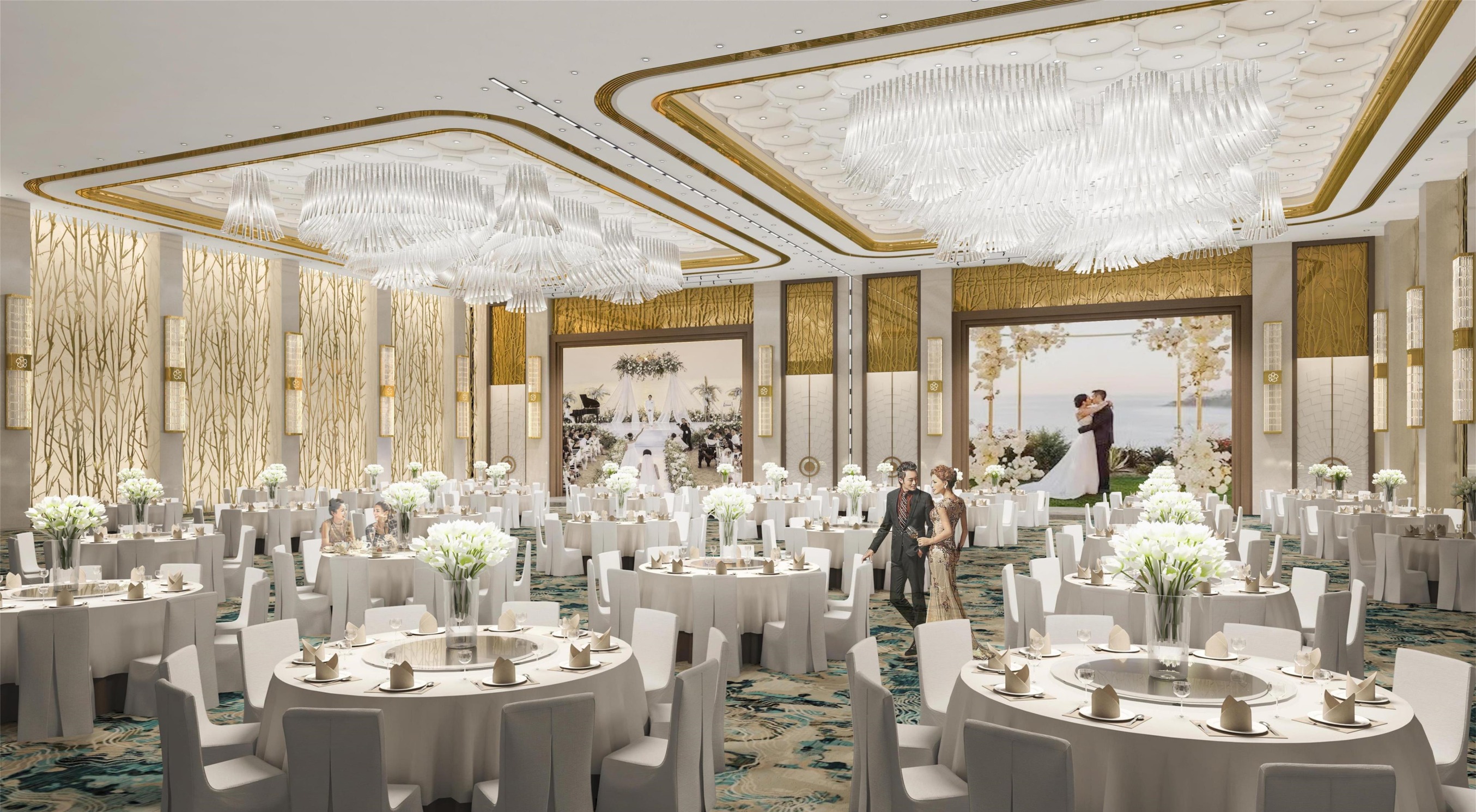 宴會(huì)廳亦是高端酒店不可或缺的組成部分,相比于酒店餐廳,宴會(huì)廳的規(guī)格更高,其使用場(chǎng)景也注定宴會(huì)廳的裝修設(shè)計(jì)要更趨于華貴典雅。為迎合不同需求,設(shè)計(jì)師專門設(shè)置了中式和西式兩大風(fēng)格的宴會(huì)廳。中式宴會(huì)廳整體裝修設(shè)計(jì)偏向素雅,以一朵垂落的巨型牡丹燈飾展現(xiàn)大氣典雅。西式宴會(huì)廳的裝修設(shè)計(jì)高端貴氣,設(shè)計(jì)師用強(qiáng)烈的顏色碰撞營造熱烈氣氛,用姿態(tài)各異的大型水晶吊燈凸顯貴雅氣質(zhì)。