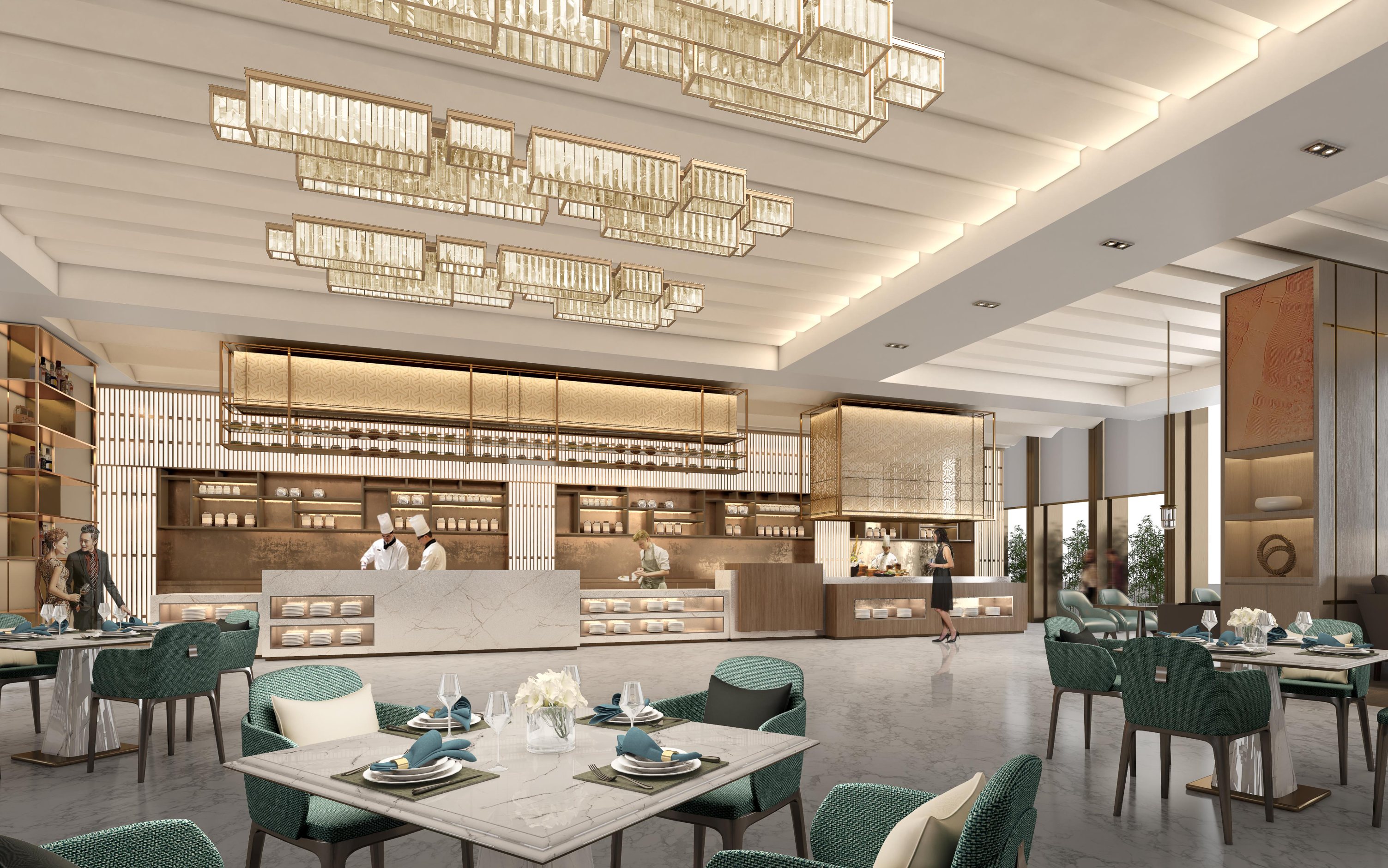 酒店餐廳作為高端酒店的標(biāo)配,其裝修設(shè)計(jì)格調(diào)也必須與酒店主體相符,這樣才不會(huì)讓消費(fèi)者產(chǎn)生割裂感。在這方面,設(shè)計(jì)師采用了與酒店大堂的同款設(shè)計(jì),用多面落地窗代替?zhèn)鹘y(tǒng)墻壁,提升整個(gè)設(shè)計(jì)的現(xiàn)代大氣感和空間通透感。同時(shí),在燈光方面,設(shè)計(jì)師也取消了主燈設(shè)計(jì),轉(zhuǎn)而用隱蔽的墻燈和兼具裝飾效用的藝術(shù)燈飾為酒店餐廳提供照明。在整體布局上,設(shè)計(jì)師將廚房設(shè)置成半開放形式,透明化了菜品的制作過程,讓消費(fèi)者對(duì)食物放心。