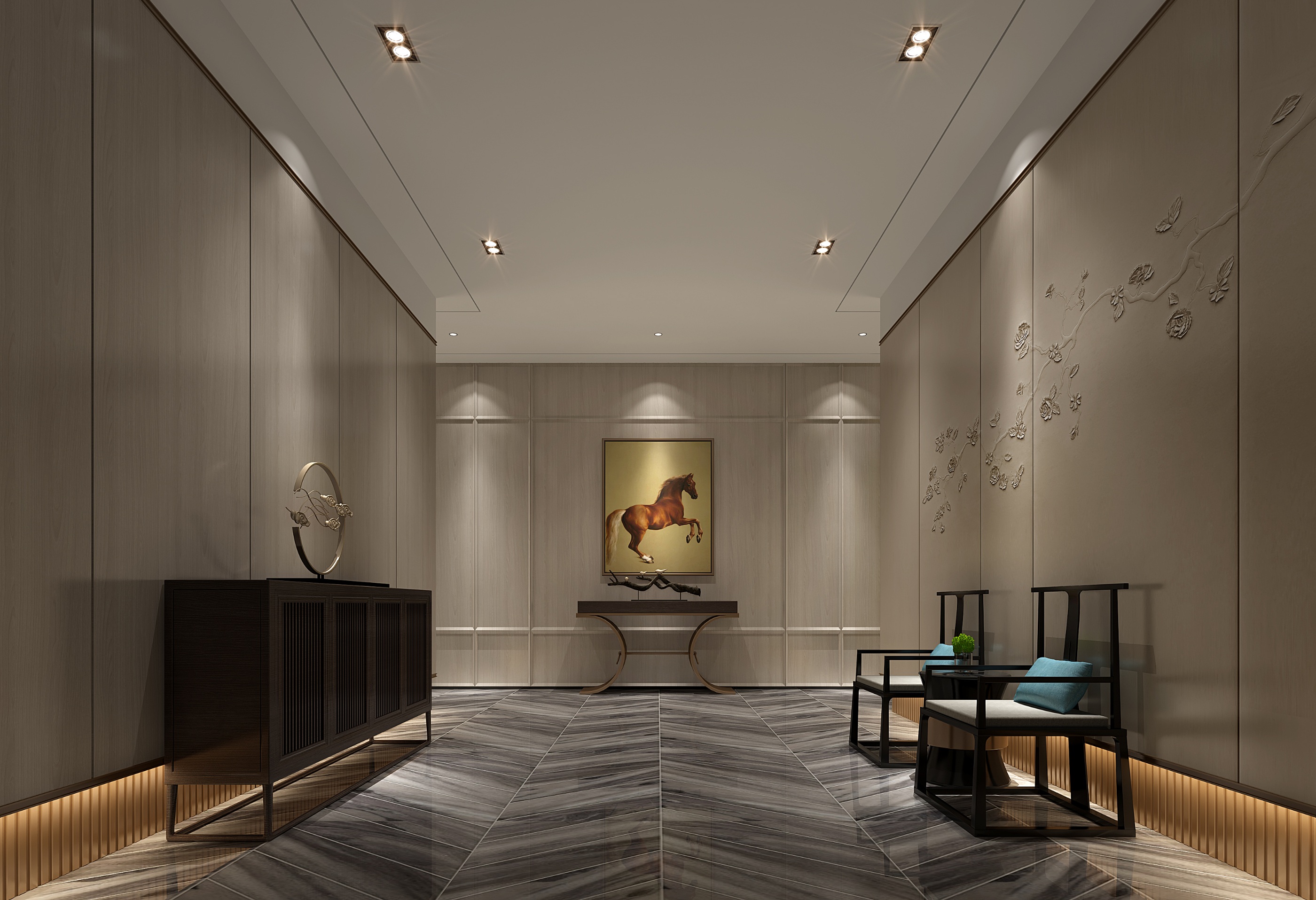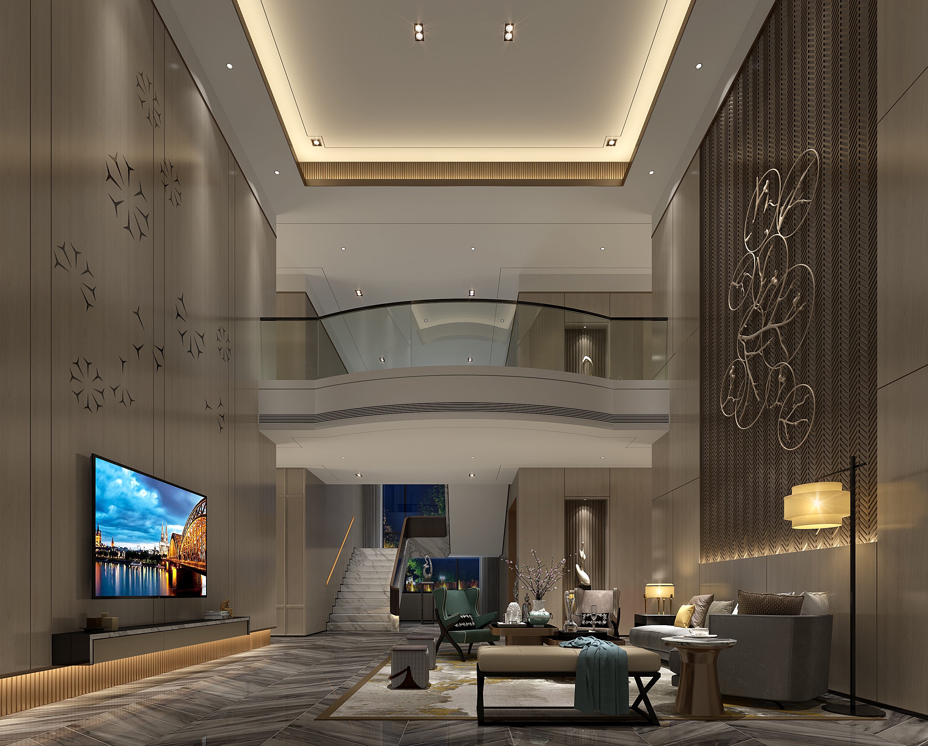 主廳設(shè)計上,設(shè)計師打通一二層之間的隔斷,極大提升了整個主廳的層高,利用高層高來直接體現(xiàn)設(shè)計的磅礴大氣。在墻面裝修設(shè)計方面,設(shè)計師在一側(cè)墻面采用抽象化的花瓣紋路印刻,和另一側(cè)墻壁的藝術(shù)簡化浮雕,共同為極簡化設(shè)計的主廳添上了幾分意蘊想象。另外,主廳一側(cè)的二樓護(hù)欄和外墻,設(shè)計師均采用透明玻璃進(jìn)行隔擋,這樣既提升了主廳整體裝修設(shè)計的通透感,又增強了空間的視覺延伸感。