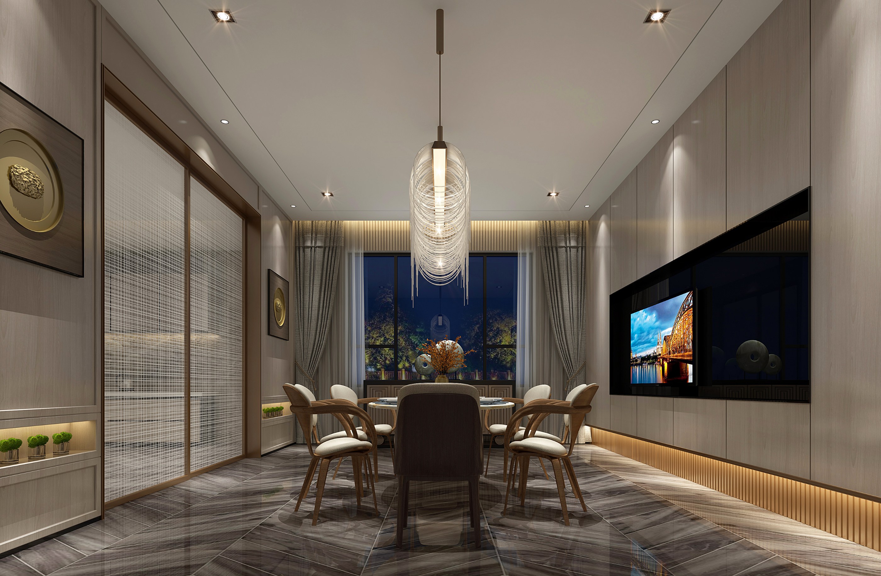 用餐區(qū)域設(shè)計返璞歸真,充滿溫馨氛圍。設(shè)計師沿用傳統(tǒng)經(jīng)典設(shè)計,將用餐區(qū)域設(shè)置在廚房之外,這樣無論是用餐還是親自下廚,這一角區(qū)域都會盈溢滿煙火氣息。同時,設(shè)計師在餐桌的一側(cè)墻壁放置了一個媒體屏幕,用以增添用餐時的娛樂和放松。除此,用餐區(qū)域的細(xì)節(jié)擺件,像滿是古韻意味的類玉石環(huán)、氤氳著藝術(shù)氣息的立體浮雕、春意盎然的植物盆栽等等,共同組成了整個用餐區(qū)域的溫馨恬靜與文化厚重感。