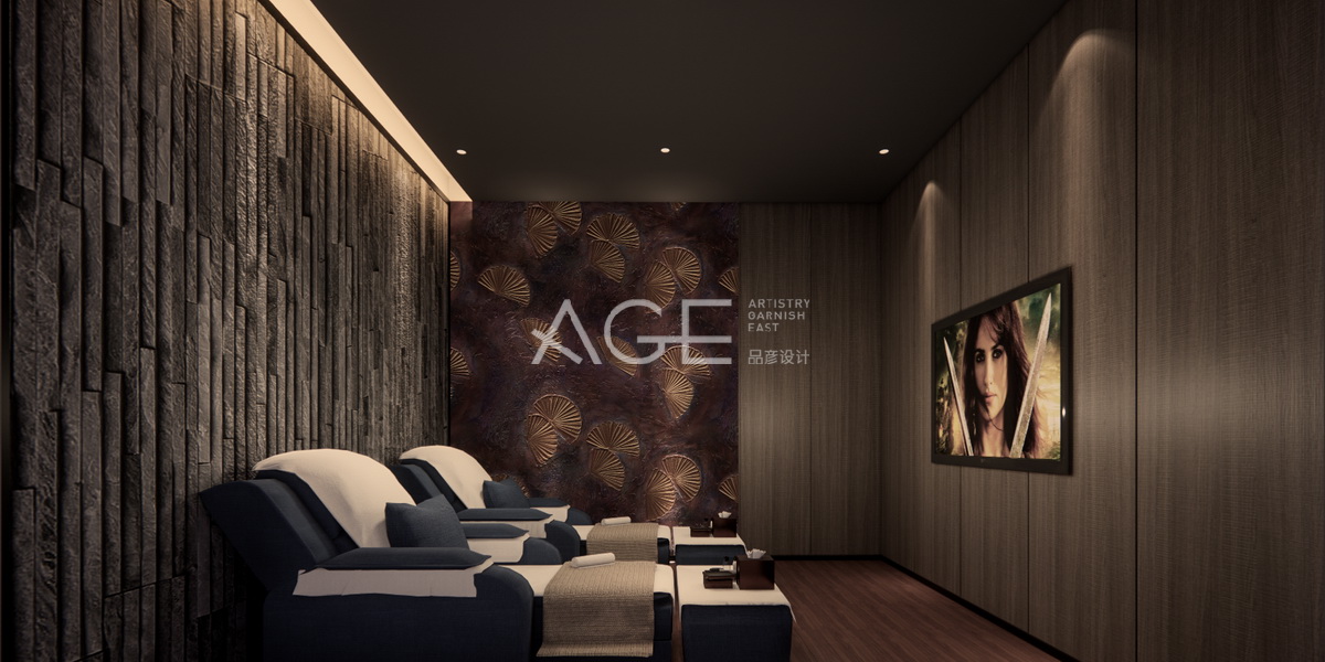 二人足浴房設(shè)計優(yōu)美造型延續(xù)暖色系色調(diào),簡潔明快,又溫暖舒適。整體室內(nèi)采用木質(zhì)元素多,其中整體一側(cè)墻面設(shè)計元素是塊狀的簡單裝飾樹皮木,為室內(nèi)增添一些自然田園氣息,與之對面一側(cè)整體裝飾為棕色平面木質(zhì)墻面相呼應(yīng),顯出層次感,這墻面中間設(shè)計安裝一臺掛式液晶大屏電視,方便讓客人躺在沙發(fā)上另一世界。室內(nèi)較小的墻面?zhèn)€性兩種圖案設(shè)計,給人一動一靜的錯落感。