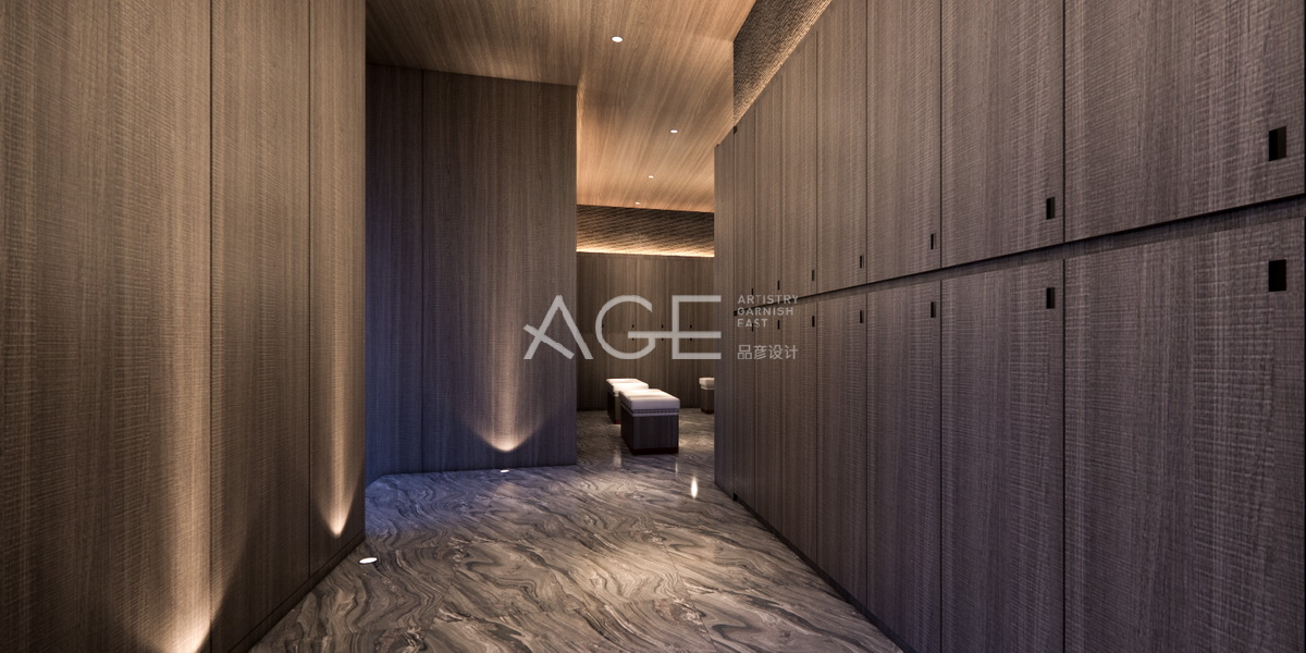 更衣房設(shè)計簡單大方,空間氣氛樸素、文雅柔和。有紋理的大理石給人一種置身水波紋的感覺,更衣柜區(qū)設(shè)計有序的長方格狀,與對面有凹造型的墻體相呼應(yīng),走入小角落一排排整齊的坐凳供可人休息。而更衣房整體墻面都是一種色調(diào)金棕色,巧妙的燈光設(shè)計,為室內(nèi)增添幾分暖意融融的感覺。