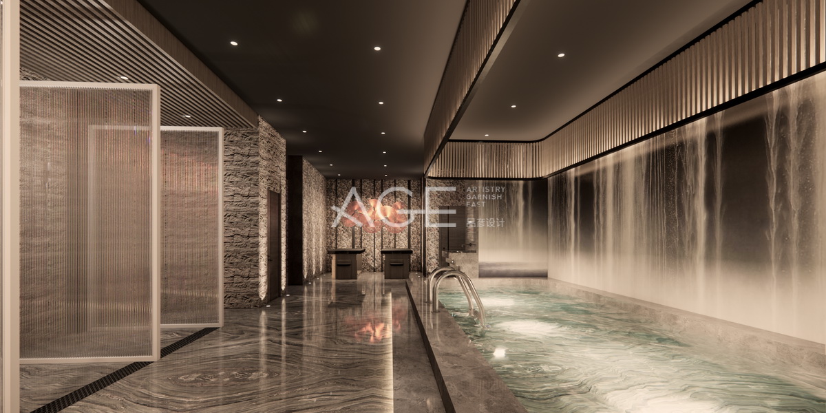 公共浴池設(shè)計的金碧輝煌,整體線條設(shè)計明朗,錯落有序,分隔出三個區(qū)域。角落更衣墻體裝飾為有石頭質(zhì)感的土色墻面,通道設(shè)計是水波紋的大理石地面,并與單色頂部形成相呼應(yīng);通道一側(cè)是一個大大碧綠泳池,與水波紋大理石又形成一動一靜的錯落感,而通道另一側(cè)是一間間淋浴間。從整體設(shè)計來看,大氣輝煌一目了然,仿佛進(jìn)入水霧世界。