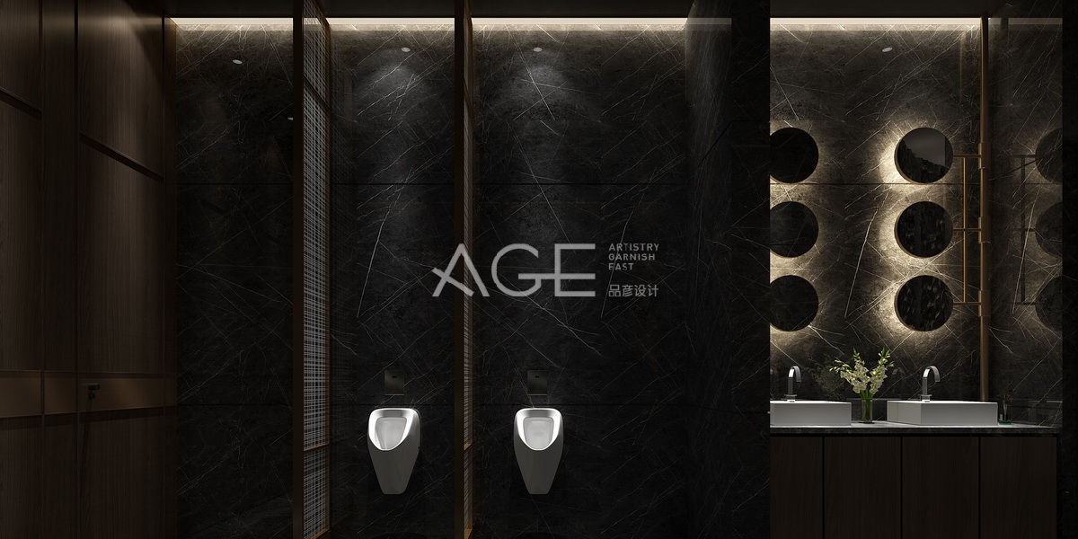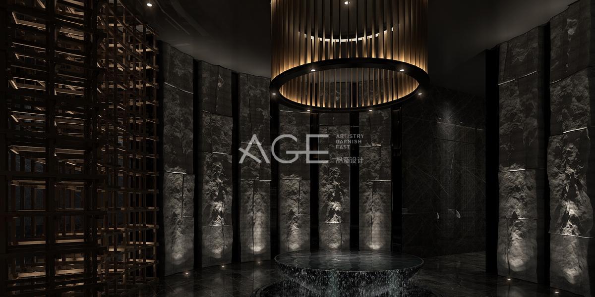 公衛(wèi)前廳整體設(shè)計與燈光交匯,以黑灰為基調(diào),更顯得華貴與神秘,加入圓的設(shè)計元素,提升高檔感,圓形環(huán)狀墻體線條讓凹凸質(zhì)感的墻面帶出層次感,條紋的大理石地板中間設(shè)計成大圓形石凳與頂部圓形吊燈相呼應(yīng),用燈光照應(yīng)出一種神秘感。