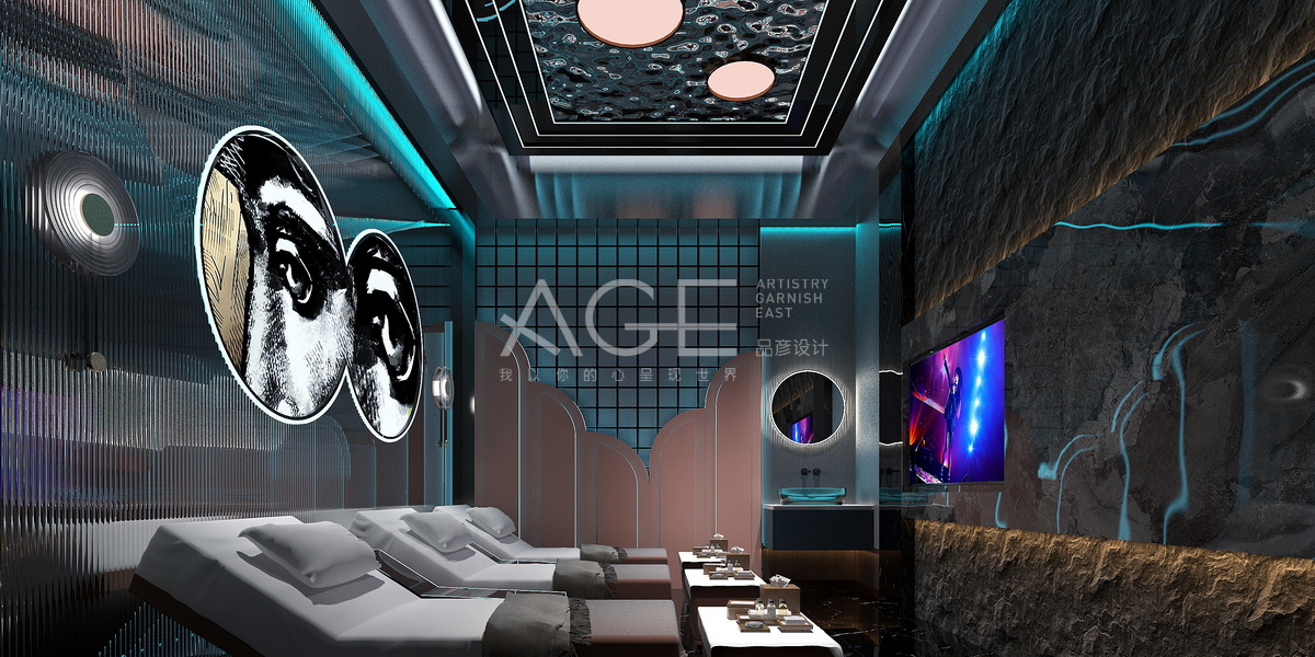 k歌沐足樣板一整體設計風格盡顯黑科技感,深藍與黑灰暗色調的搭配營造出一種神秘的幻影世界,天花板和墻體都有加入立體線條圖案元素,仿佛讓人置身于外太空,于是放松就在此刻。k歌沐足樣板二則延續(xù)黑科技的設計風格,深棕色與黑灰色再用粉色點綴營造出一種森林的神秘,天花板和墻體加入圓和線條的元素,讓空間立馬有立體感,且?guī)Ыo人的是放松的氣息。k歌沐足樣板三整體延續(xù)k歌沐足樣板二的設計風格,只不過色彩上除了棕色與黑灰色,點綴色加上粉色和藍色,使得空間更顯精致。