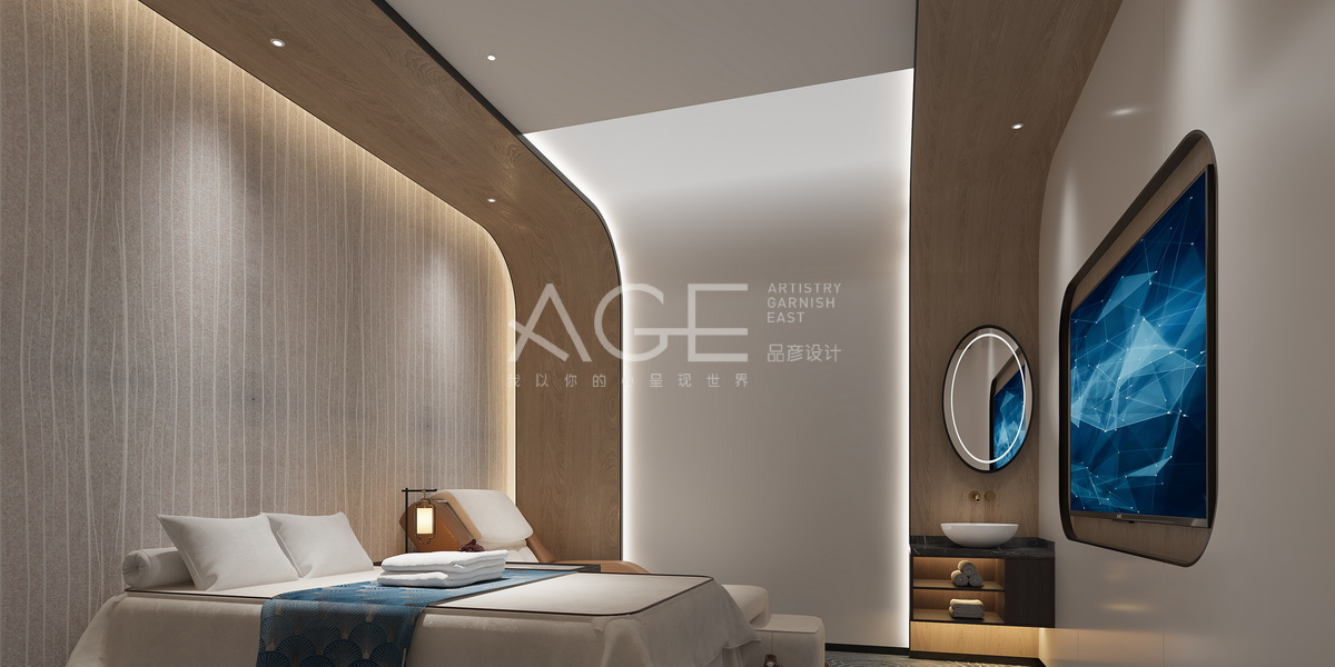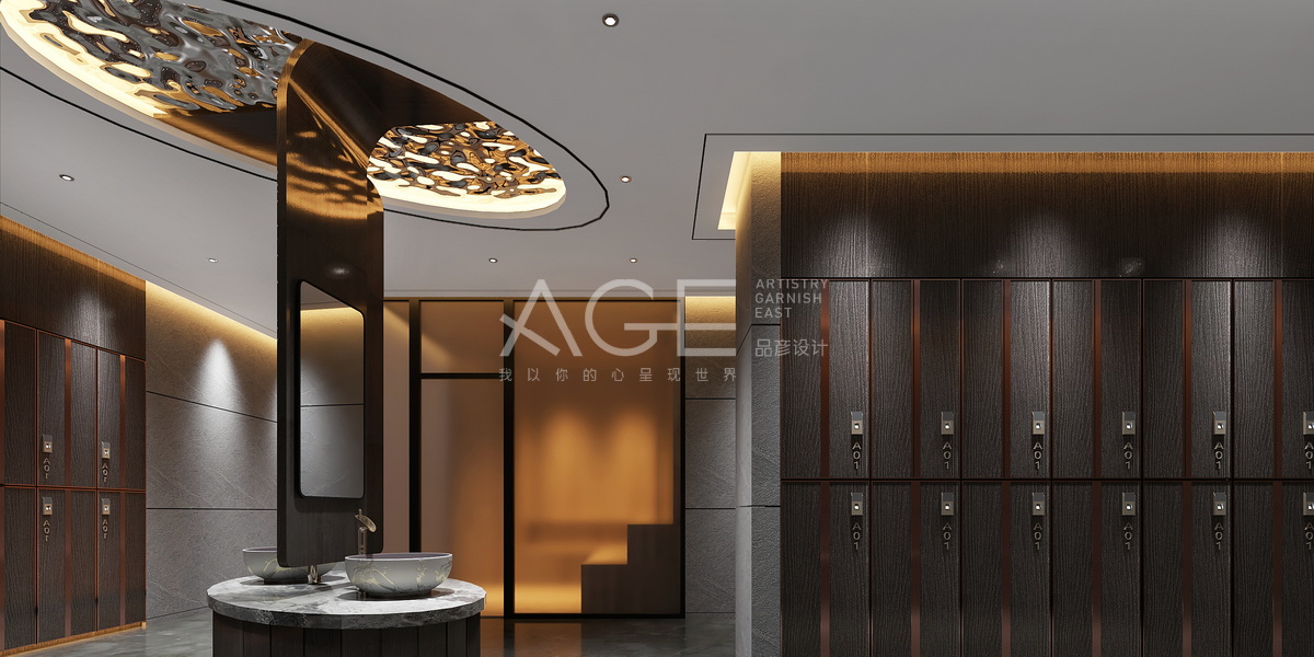 水吧區(qū)的設計風格時髦又精致,暗色調的設計和藍色點綴營造出凹凸的美,上方與下方呈現(xiàn)對稱的效果,但又有區(qū)別的設計,采用線條和方形帶出了立體層次感。按摩房整體設計風格帶出精致的優(yōu)越質感,棕色調的設計營造出暖暖的放松氣氛,天花板和墻體加入長形和方形的元素,讓空間呈現(xiàn)出不一樣的立體效果。男賓更衣室的設計風格呈現(xiàn)低調的奢華之氣,灰色系與黑色系的搭配營造出高貴的優(yōu)越,個性的洗漱臺上下不規(guī)則的圓又與墻體長方形衣柜形成相呼應的美,并且體現(xiàn)出一種優(yōu)越的氣場。