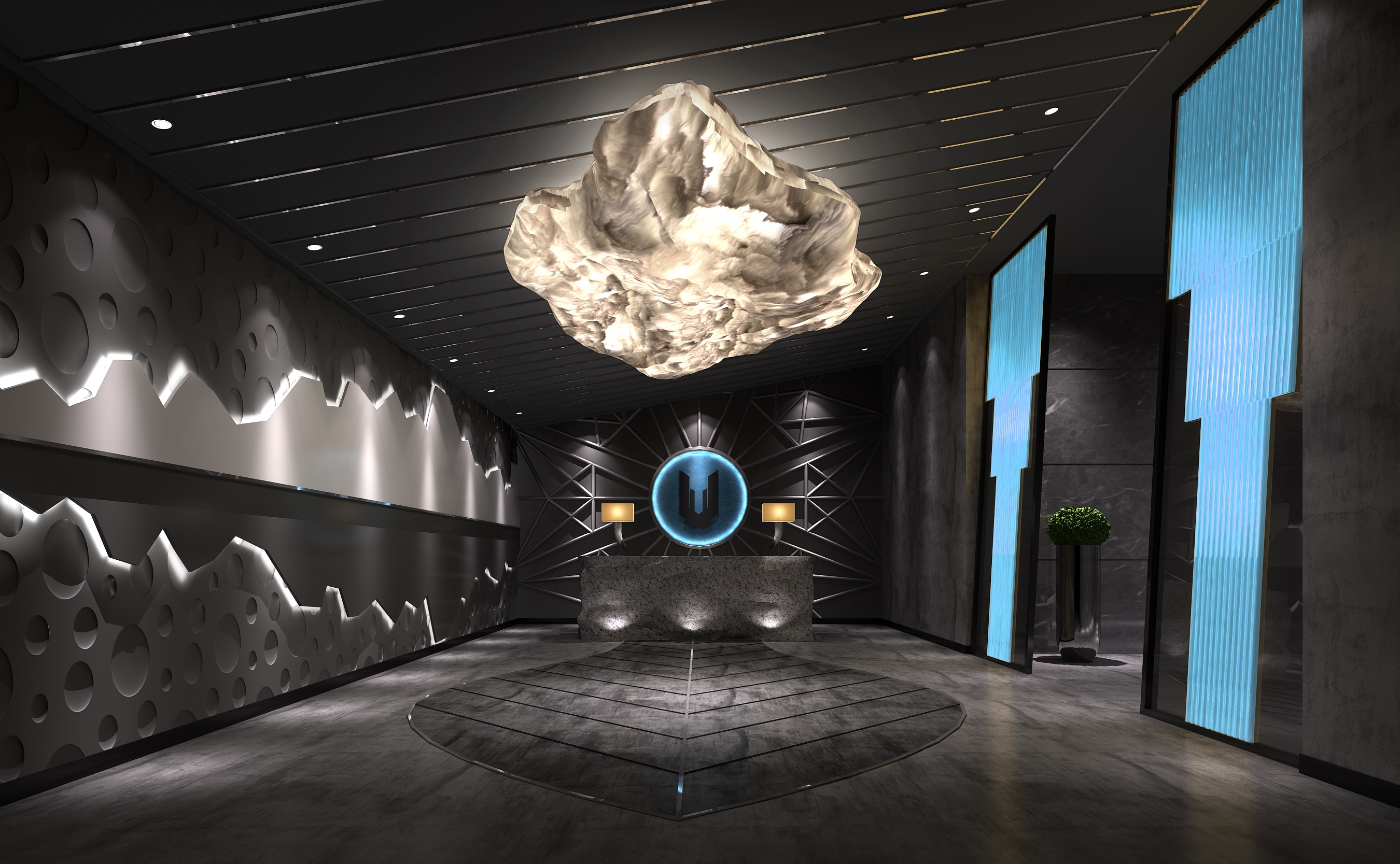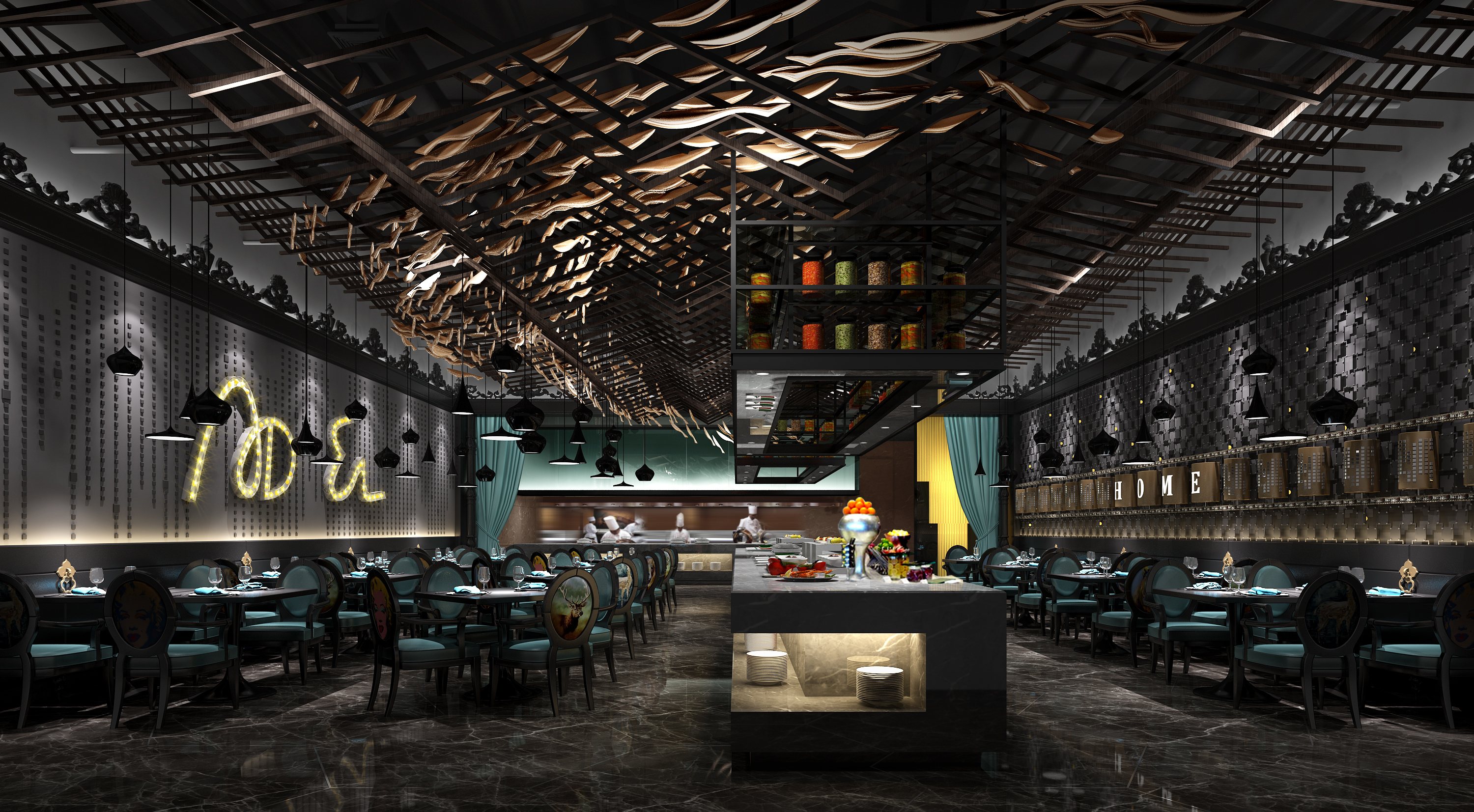 前臺(tái)大堂室內(nèi)裝修設(shè)計(jì)整體采用灰黑色調(diào),用以提升整個(gè)餐廳的質(zhì)感格調(diào)。在墻面裝修設(shè)計(jì)上,設(shè)計(jì)師采用不規(guī)則的立體拼接設(shè)計(jì),在原本類比月球表面凹凸不平的圓坑裝飾上布置了一面浮起的不規(guī)則雙色墻板,以此增強(qiáng)視覺沖擊感和設(shè)計(jì)立體感。吊頂設(shè)計(jì)上,設(shè)計(jì)師用如云似玉的大型夢(mèng)幻吊燈,一下子抓住了消費(fèi)者目光。入口兩側(cè)設(shè)計(jì)的兩面燈帶,可以隨意變換顏色,為搭配和氛圍塑造增添了無限可能。